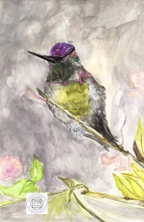 This tranquil painting captures the delicate beauty of a purple-crowned hummingbird resting on a branch, its vibrant green breast standing out against the soft grey and white background. Inspired by my friend and her frequent, cherished, garden visitor. This soothing piece is perfect for creating a calming atmosphere in any space … whether adorning a living room, bedroom, or a cozy nook, making it a wonderful housewarming gift.