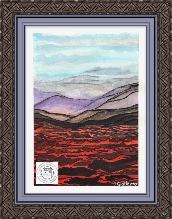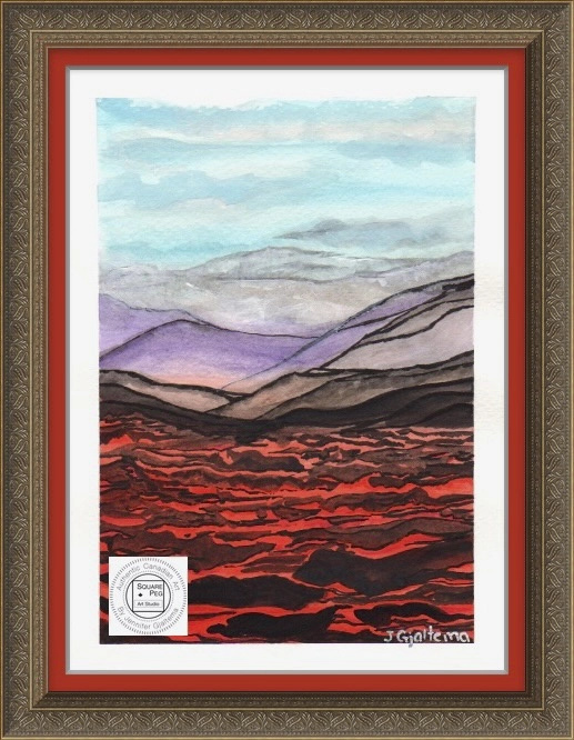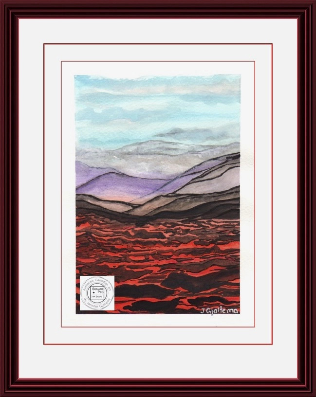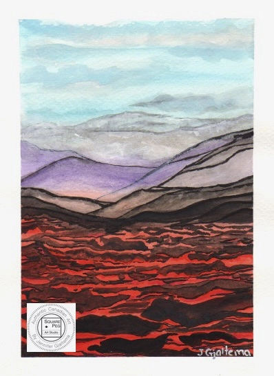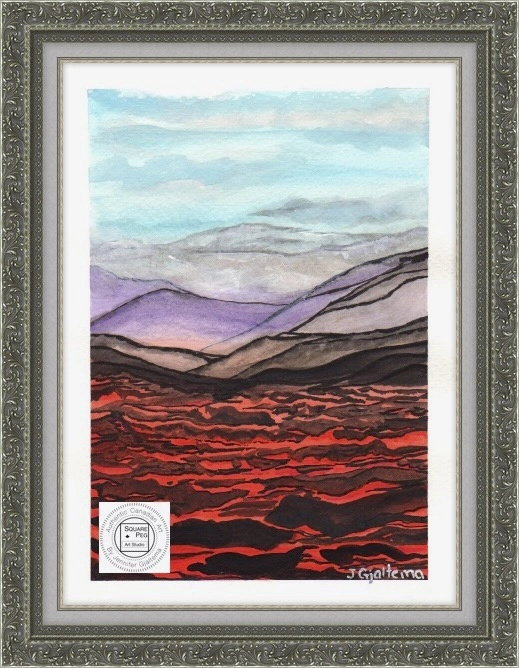Molten lava courses over the rugged landscape, igniting the earth with rivers of fire, as it moves through the shadows of ancient, grey mountains. The blue sky above remains undisturbed, offering a peaceful backdrop to the unfolding drama below. A testament to nature’s raw, untamed power, the painting captures the birth of new earth through the awe-inspiring actions of earth’s tectonic forces.