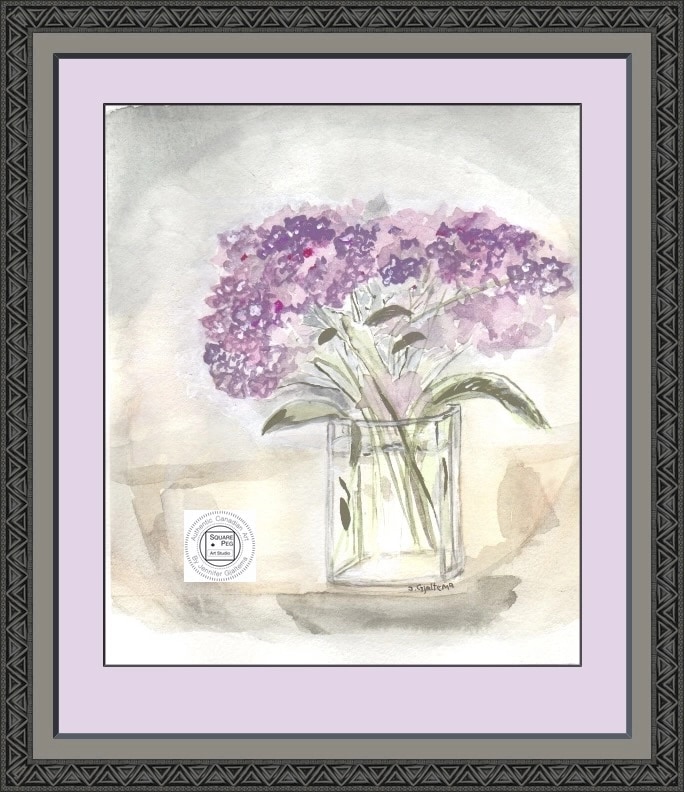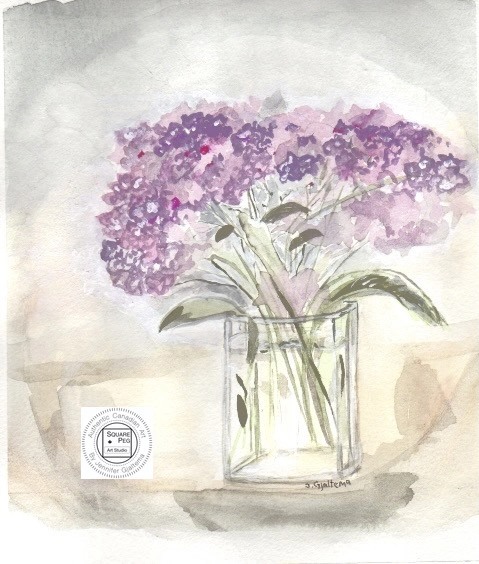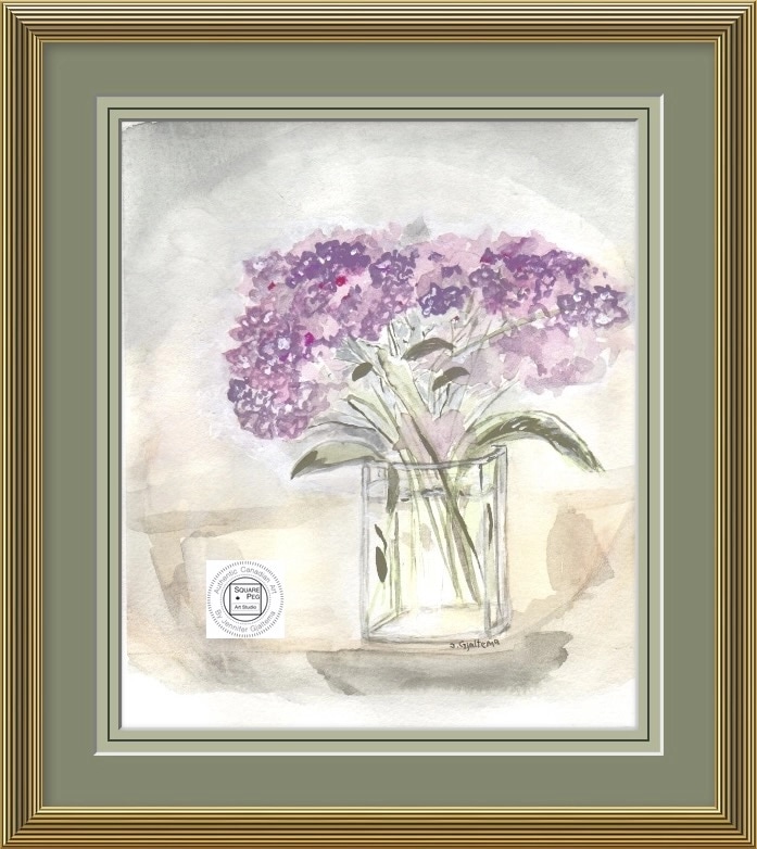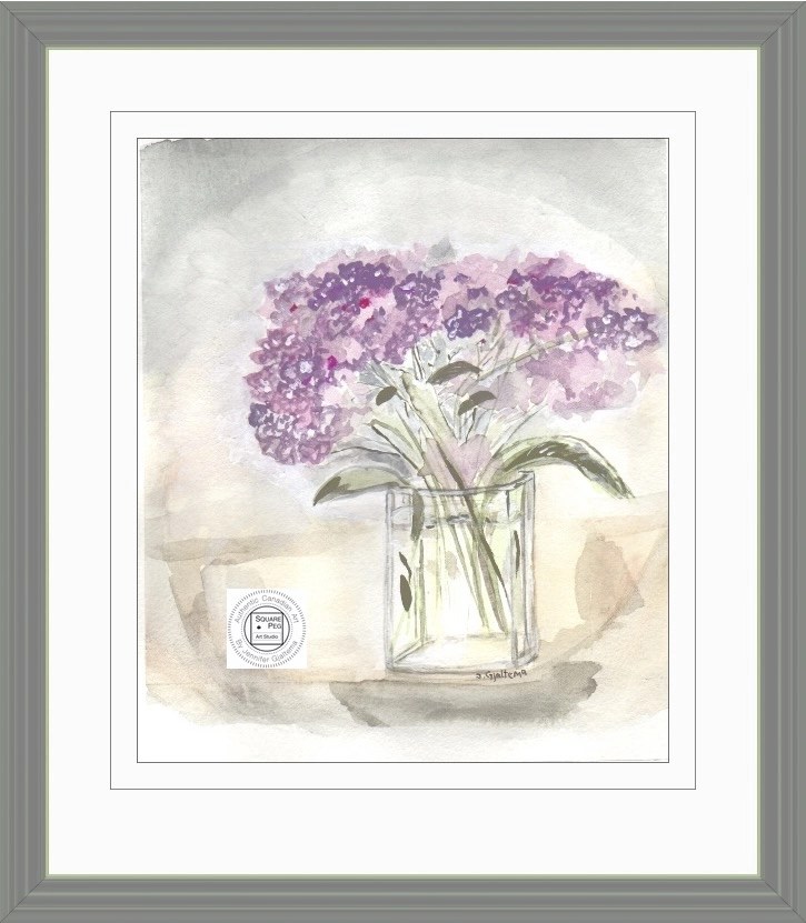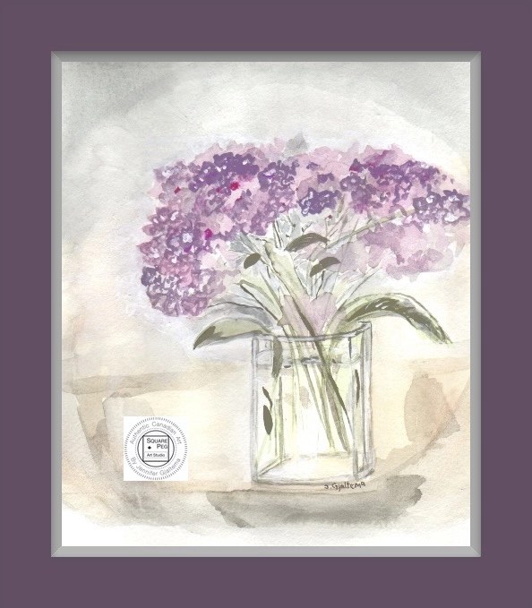 This painting showcases a relaxed bouquet of purple hydrangeas resting in a simple glass vase. Soft petals and subtle shades of lavender evoke a sense of calm and simplicity, Viewers are invited to enjoy a moment of calm with these timeless garden flowers.