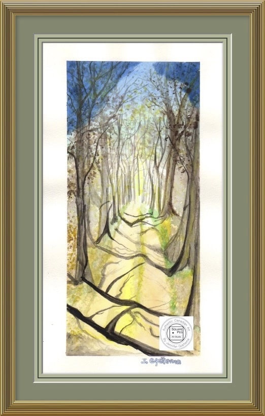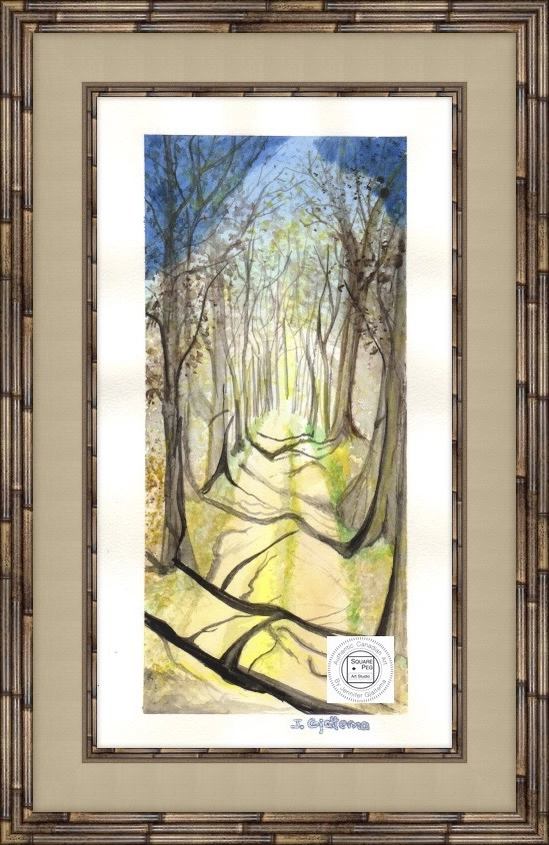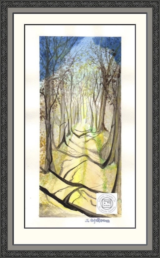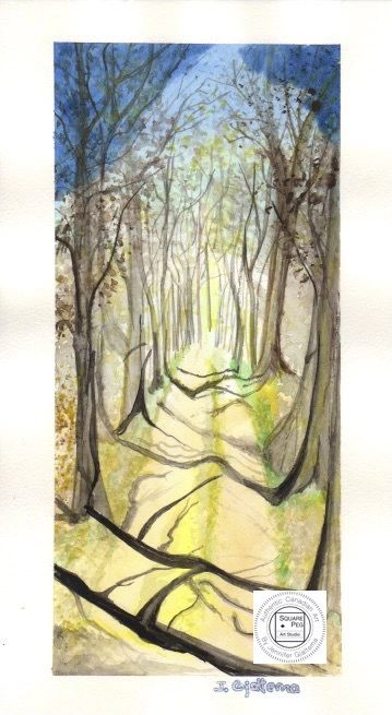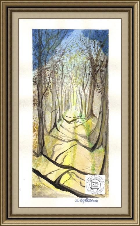 This artwork showcases the interplay of light and shadow on the trees in the forest on a sunny day A single-lane road winds through the trees, bearing witness to the effects of light and shadows. Warm earthy tones of yellow and brown create a sense of calm and connection to nature, while subtle blues enhance the overall depth. A perfect piece for nature enthusiasts or those who cherish the charm of the Dutch countryside. Inspired by the artist’s own photograph, this piece is a fitting keepsake for anyone who loves the beauty of nature.