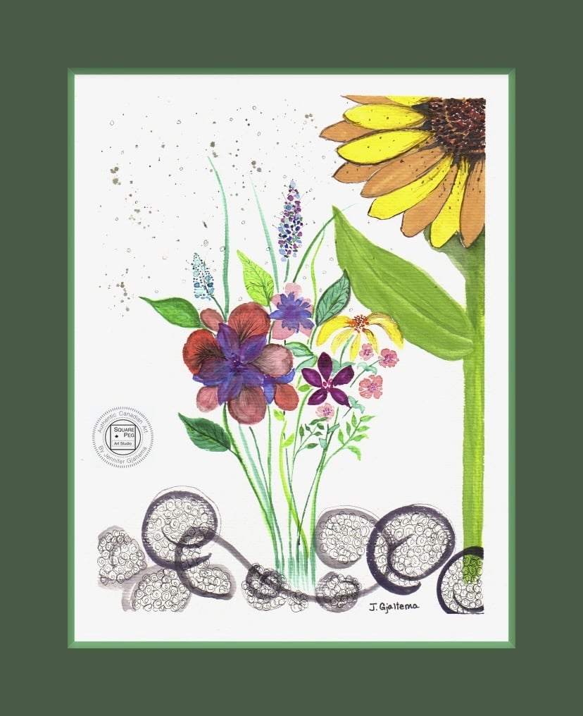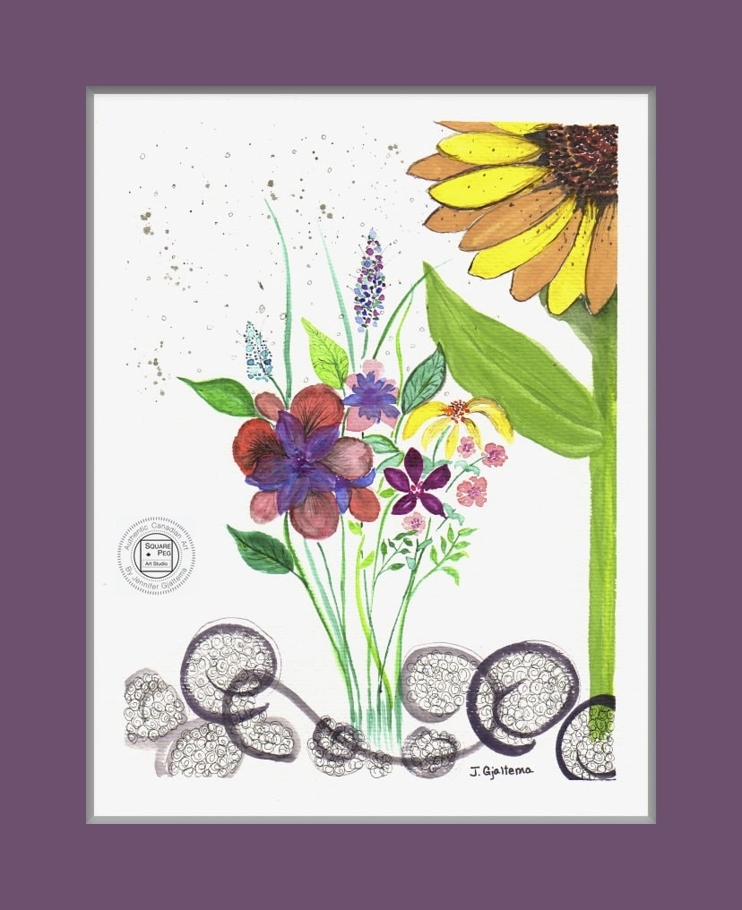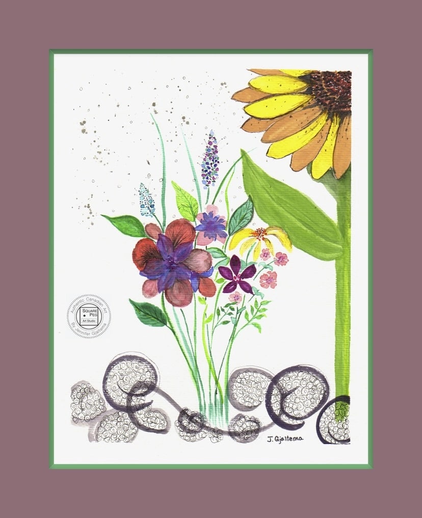 Shortly after we adopted a Main Coon cat from Ukraine, Russia invaded Ukraine. This painting expresses priority support for Ukraine over the needs of other world nations with the prominence of the sunflower, a symbol of Ukraine, over the bouquet of flowers representing other nations. The colourful, bright painting is in stark contrast to the horrors of war.