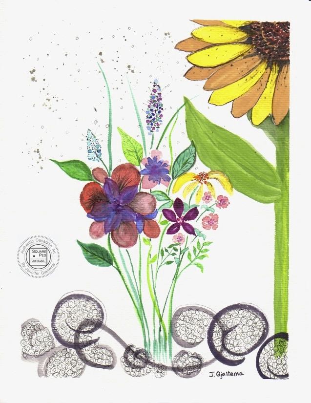 A Large Sunflower overshadows a colourful bouquet of smaller flowers. Ukraine's war must take priority. A Watercolour.