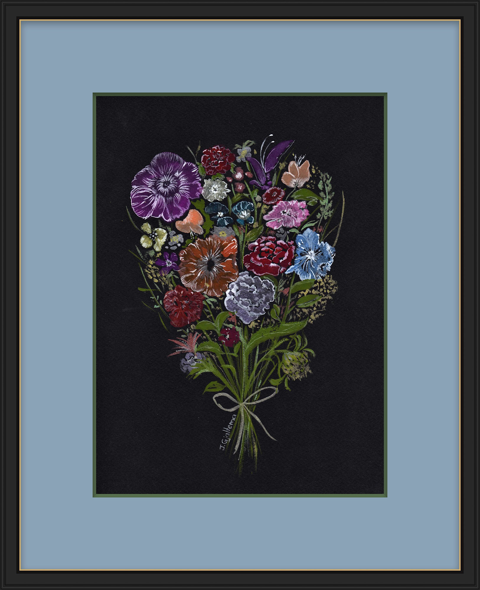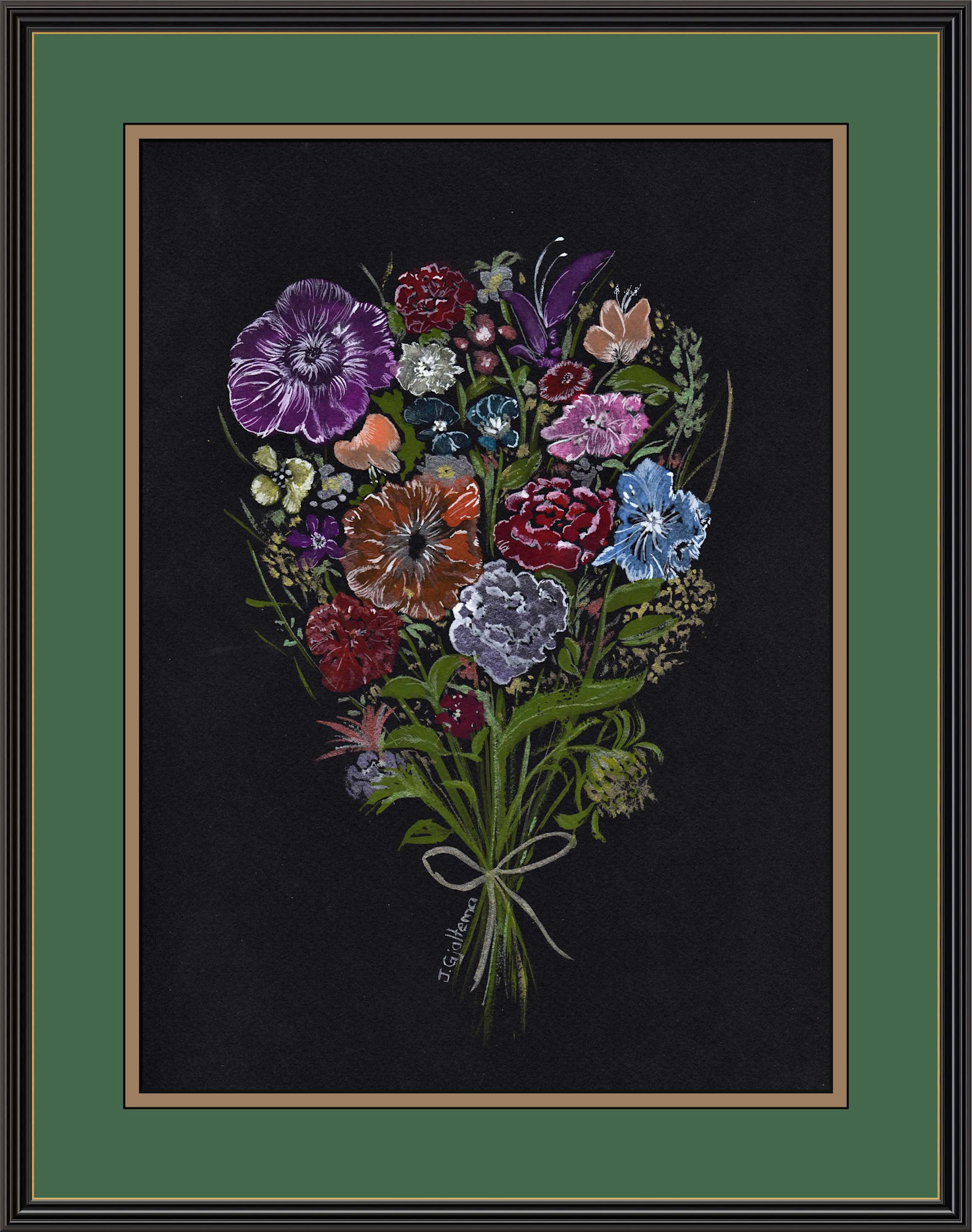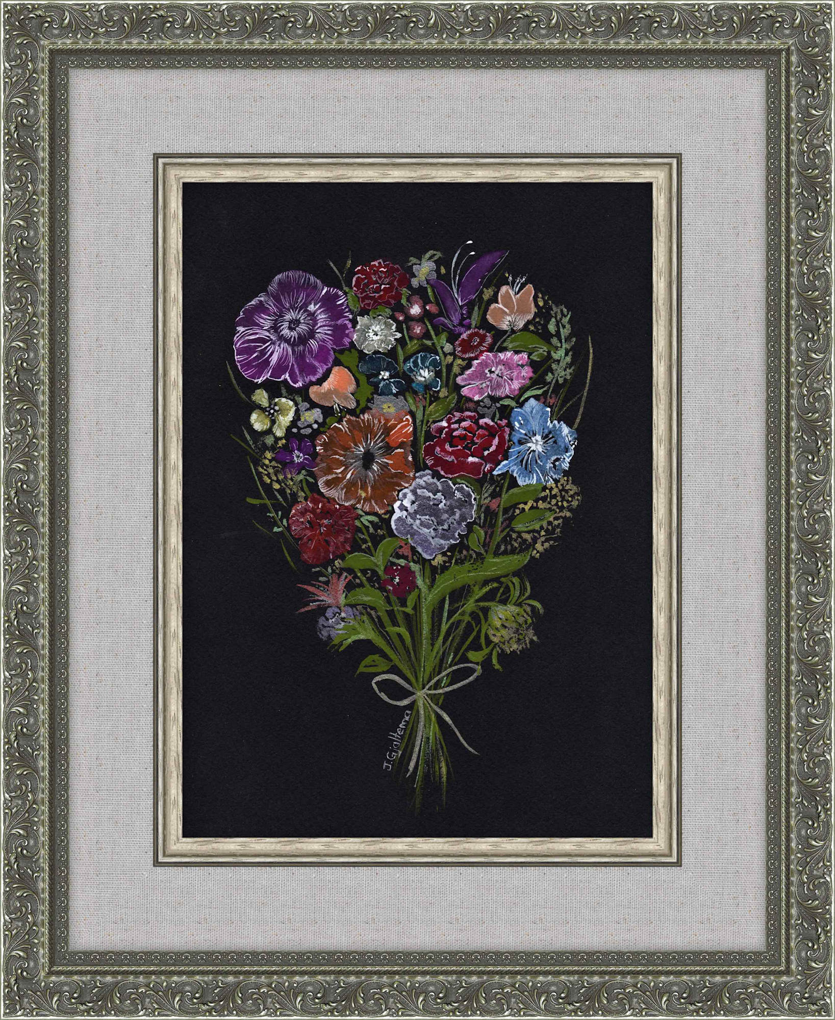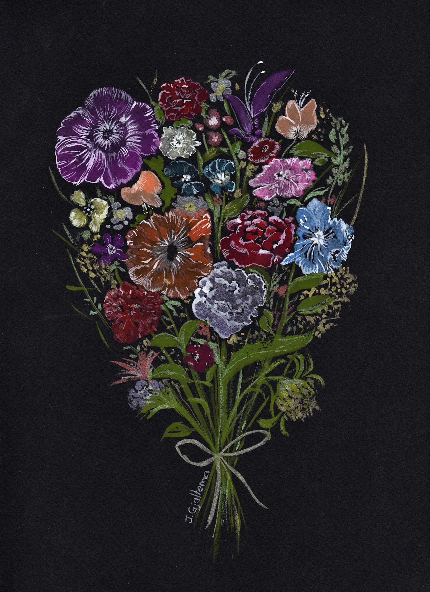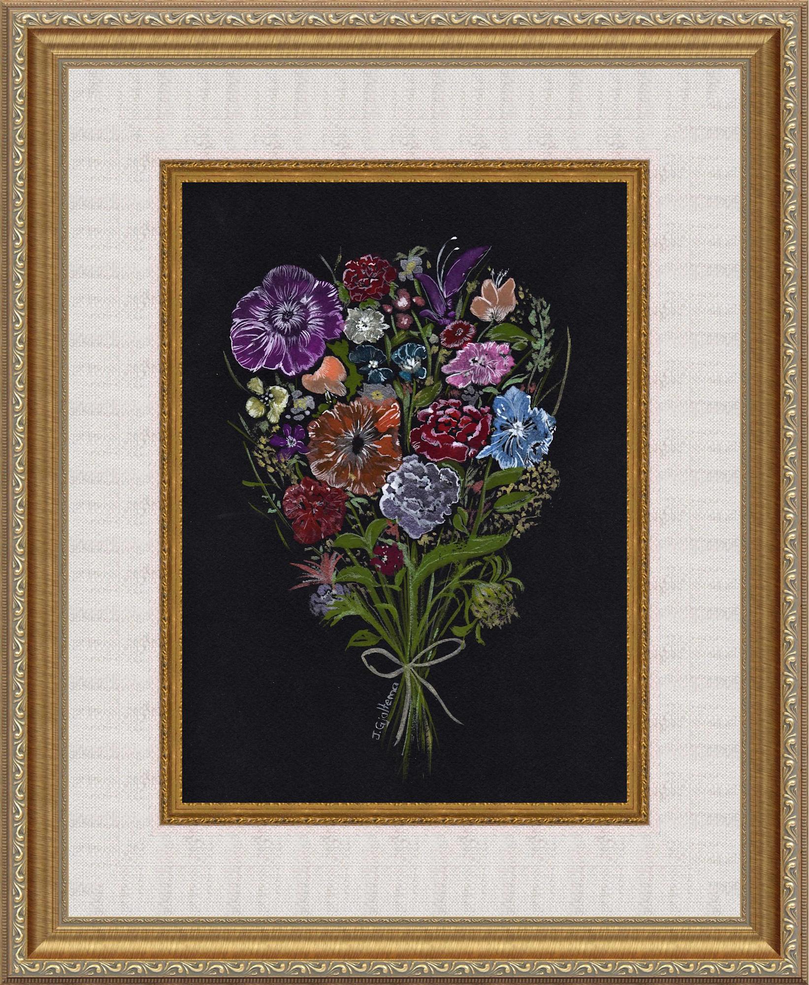Bright, multi-coloured bouquet of flowers captured as if by flash photography. Done in embroidery style on a black background