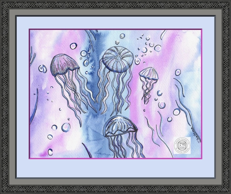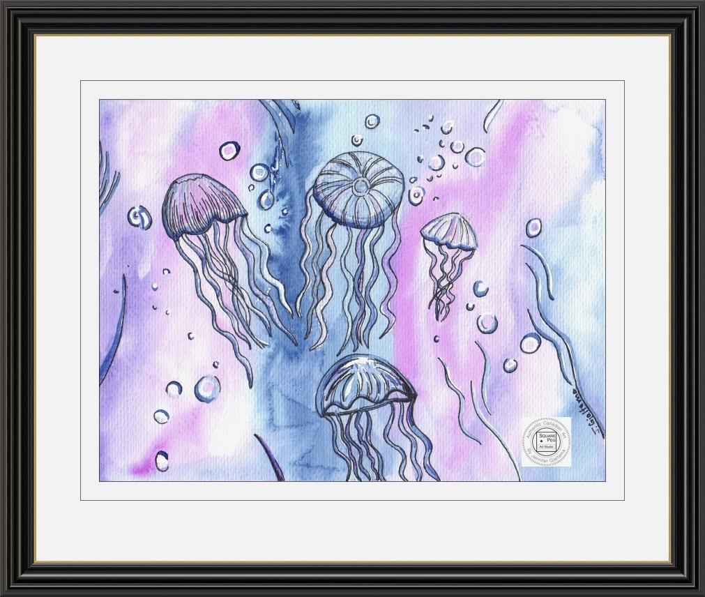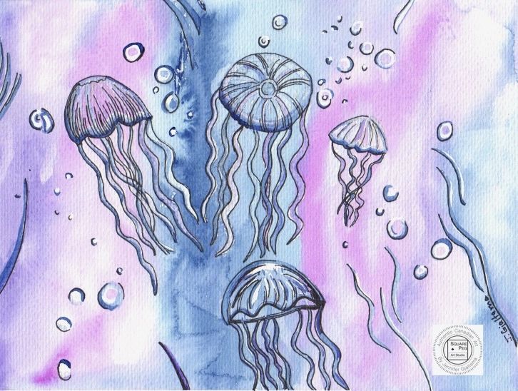 This painting is bright, colourful and presents an abstract interpretation of a jellyfish get-together. It captures the quiet solitude of a life below water.