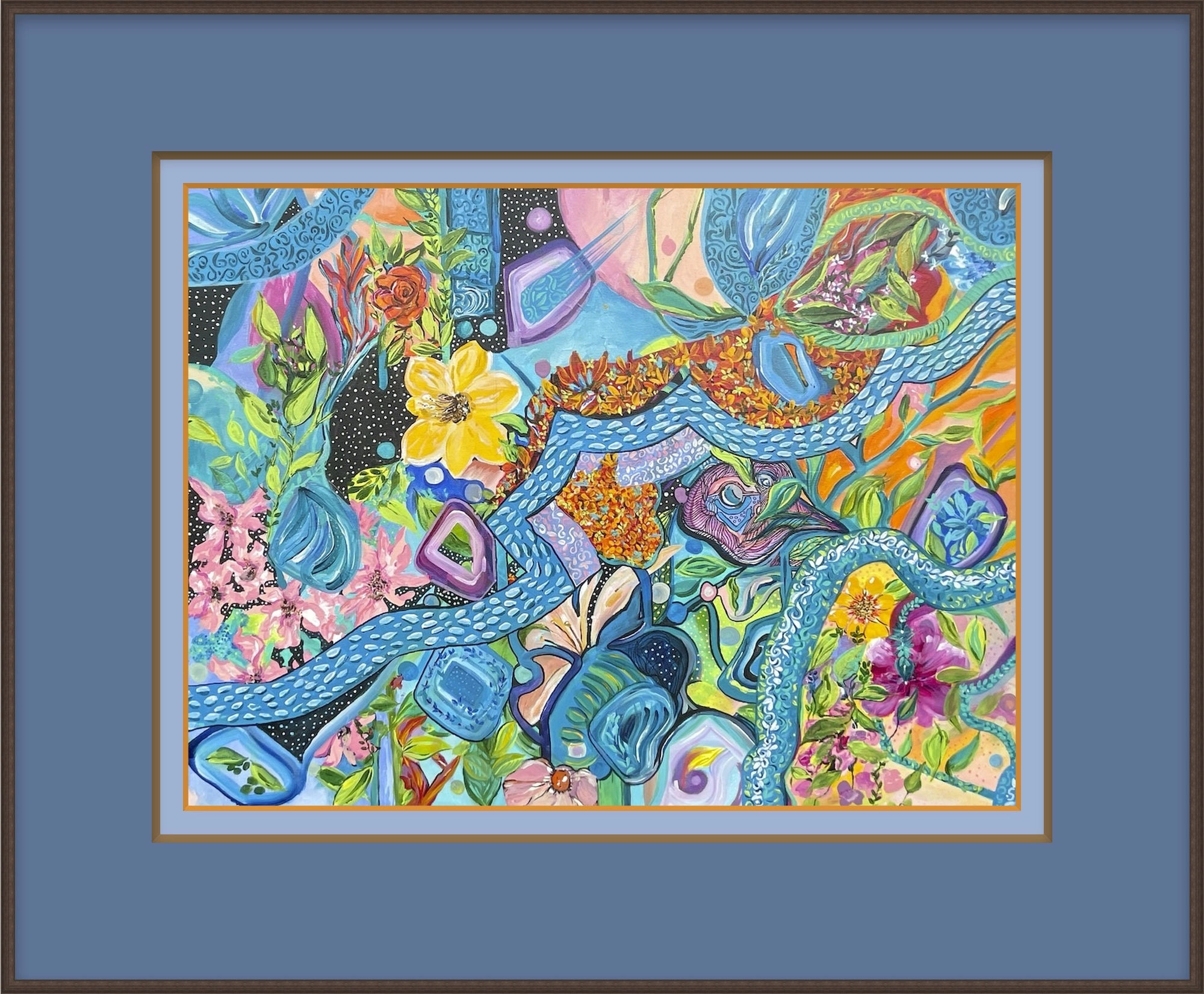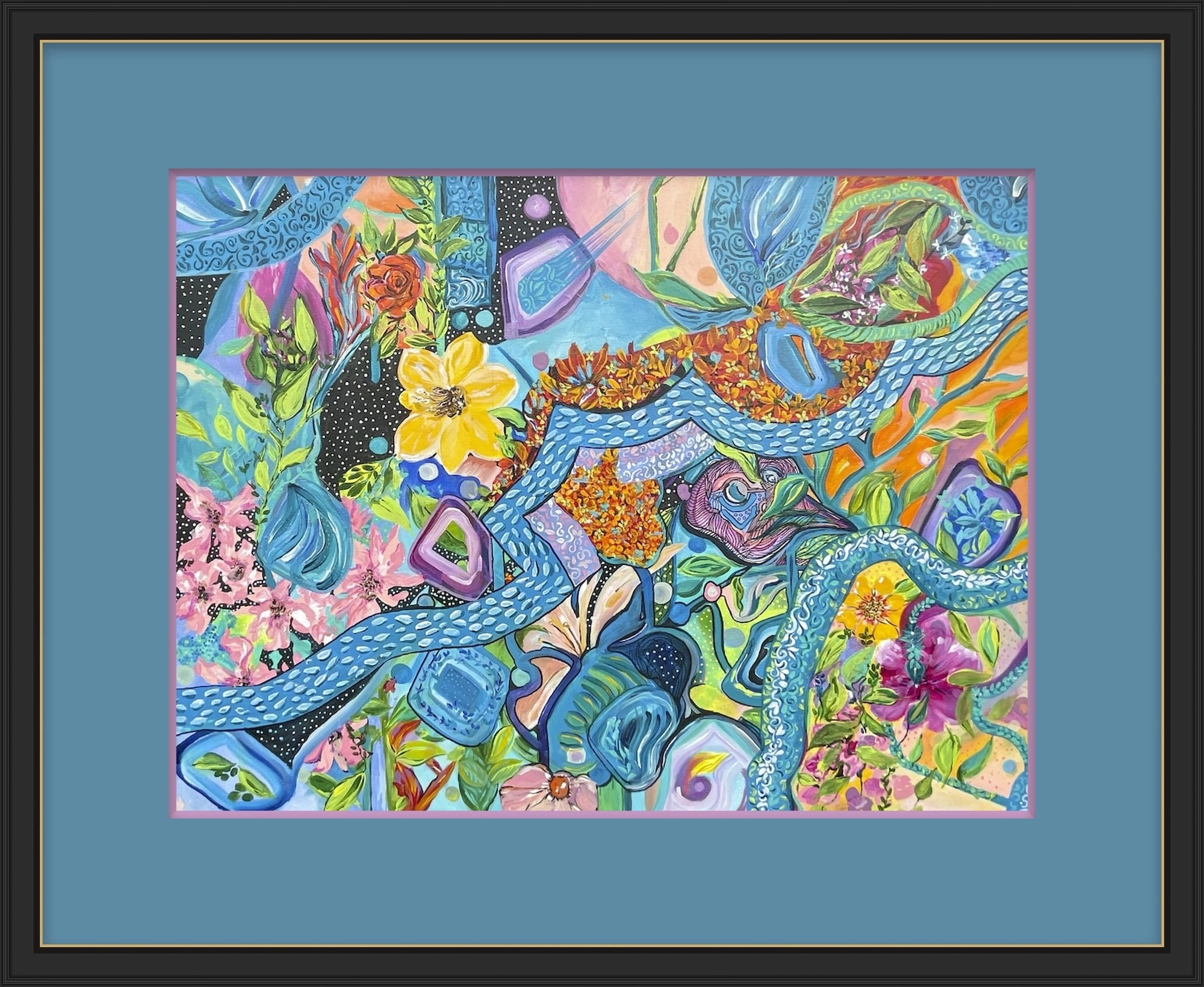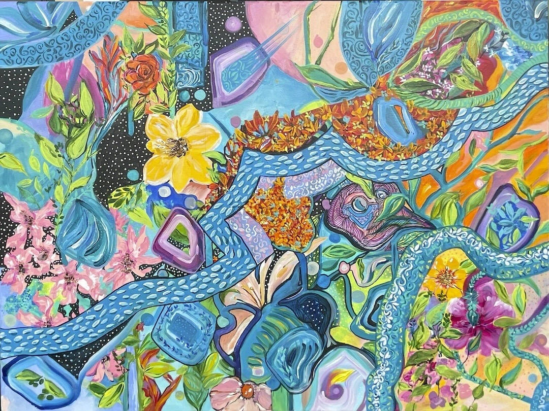 With summer drawing to a close, I noticed something remarkable in my garden. Unfamiliar flowers and plants, vibrant in every shade, have sprouted up unexpectedly. This painting portrays that scene—a spontaneous, joyous Garden Party, where all shapes and colours embrace their natural beauty and growth. The wild assortment of blooms, some unknown to me at the start of the season, now fill my garden with life and celebration. The party is not planned, but nature knows how to gather beautifully on its own, expressing the harmonious yet chaotic wonders of growth, transformation, and the undeniable energy of life.