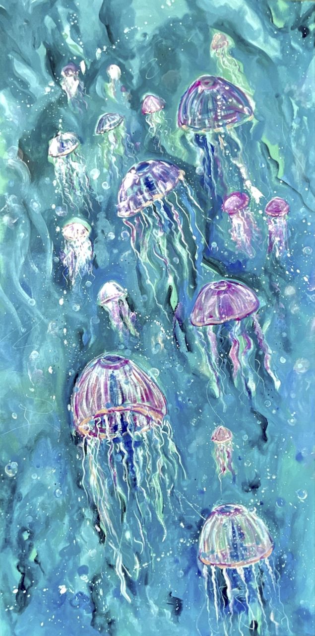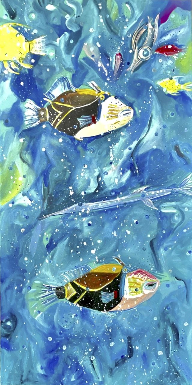 These three panels are especially close to my heart because I commissioned them as a way to bring a little bit of the ocean right up to my back door. With a pool in the yard, I wanted the feeling that, when you step outside, you’re stepping toward the sea. Hawaii has been a big part of our story: we were married there, and we’ve spent many vacations exploring the islands and surrounding waters with our Hawaiian friends. Those memories are painted into every line and colour of this series.