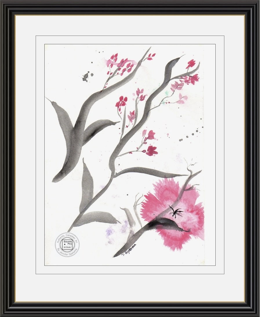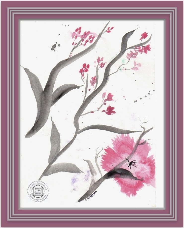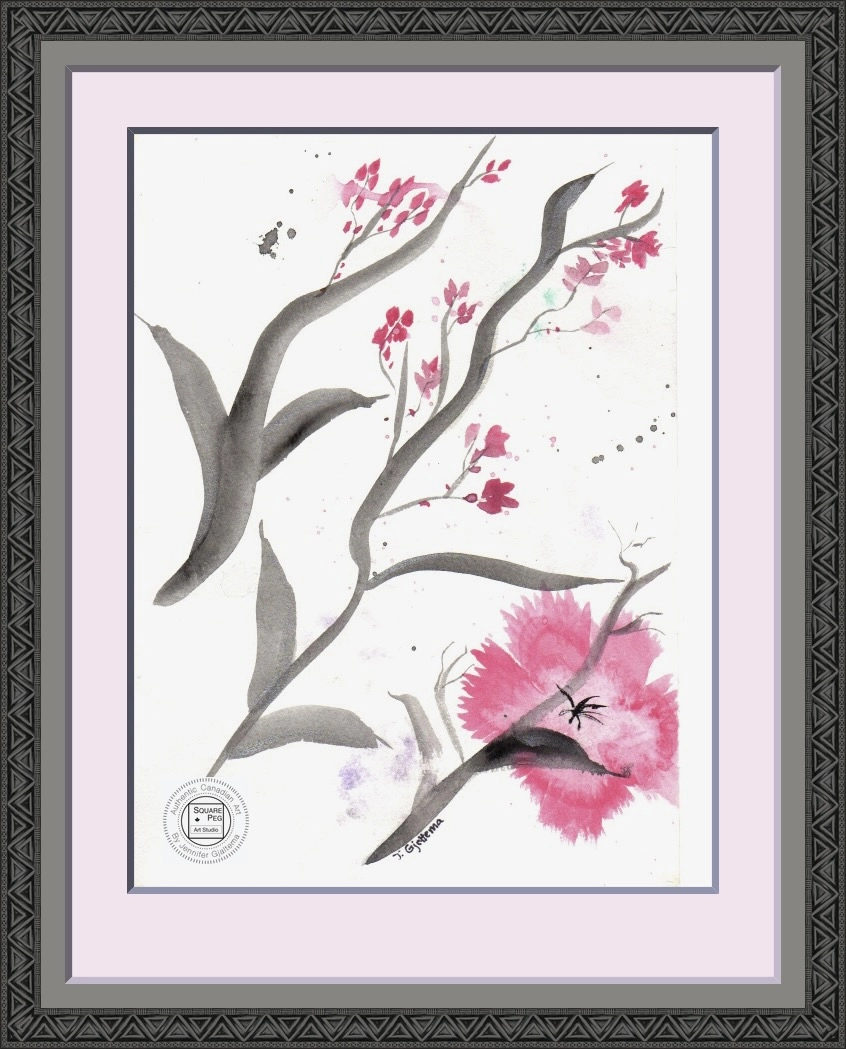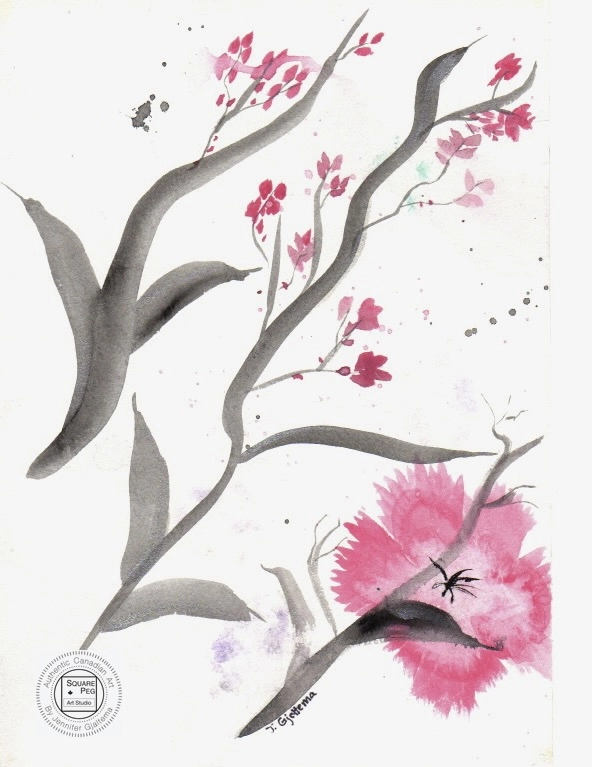 This painting captures ethereal pink blossoms on wispy grey branches presented on a white background.