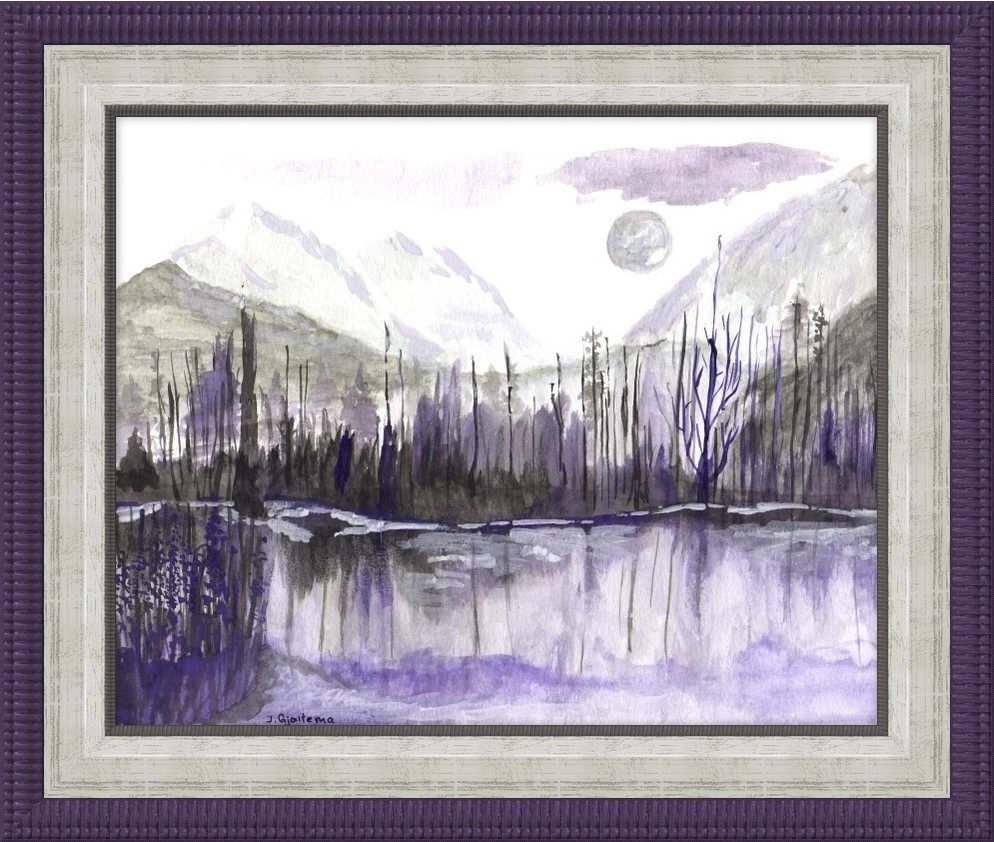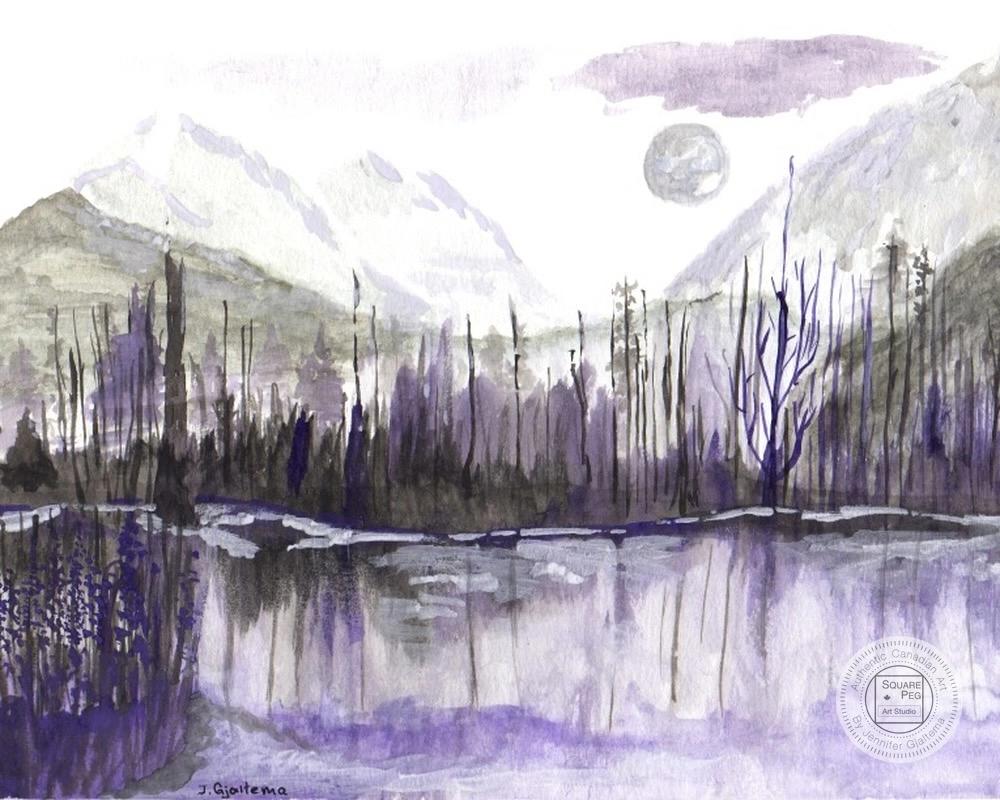 A peaceful, remote, lake scene in early spring in BC, in shades of purple, black and green. The hills are still dusted in snow and the ice is receding on the lake. The green and mauve colours exaggerate the feeling of quiet isolation. The original painting was a custom project for a person who loved mauves and purples.