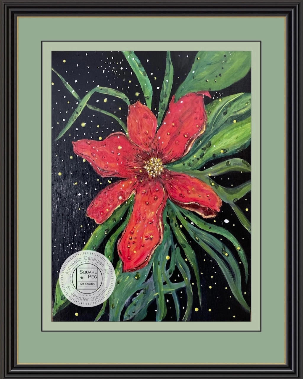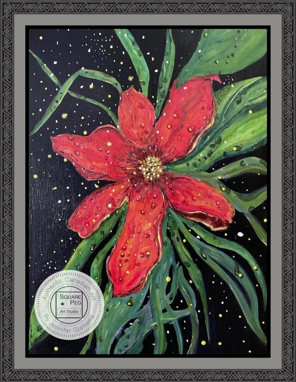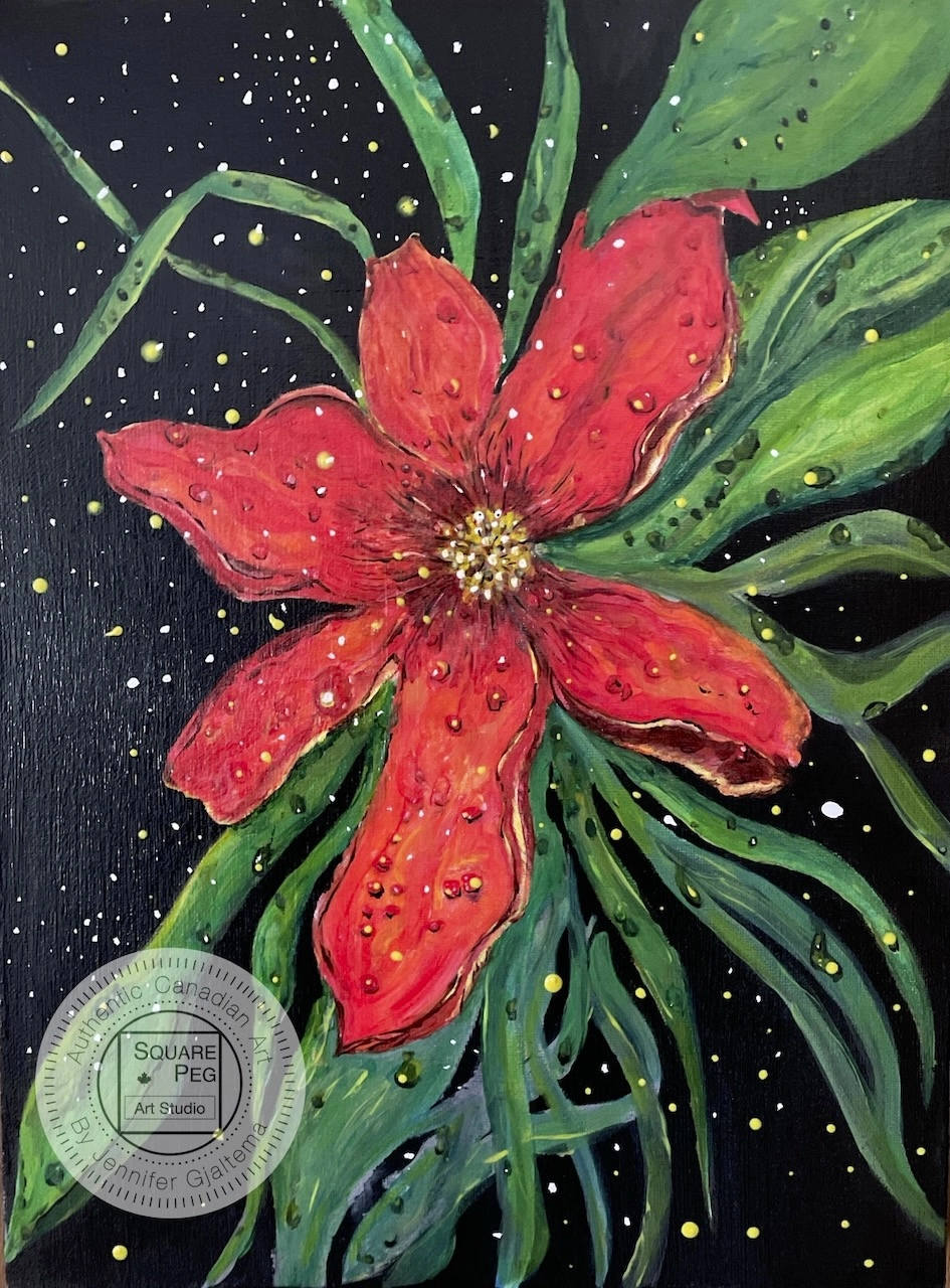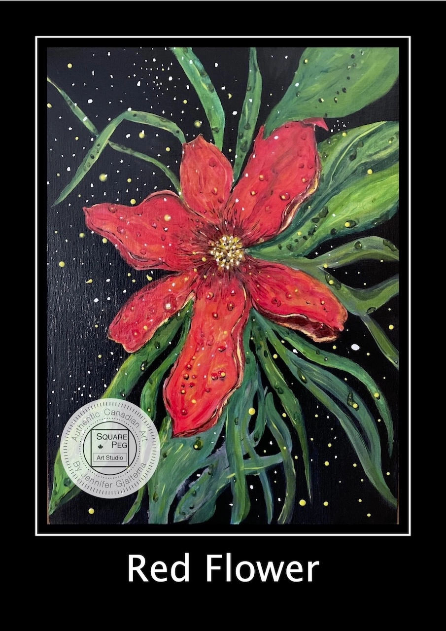 I wanted to produce a canvas that would "stand out in a crowd". This painting started life dressed in calm pinks, muted greens and black. I wasn't happy, and repainted it in its present colours. It certainly stands out !!!