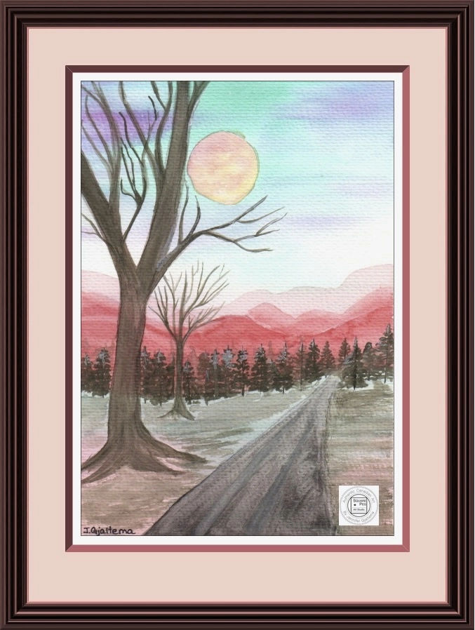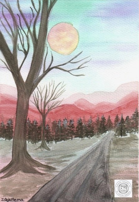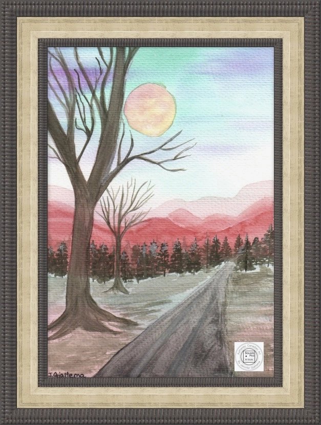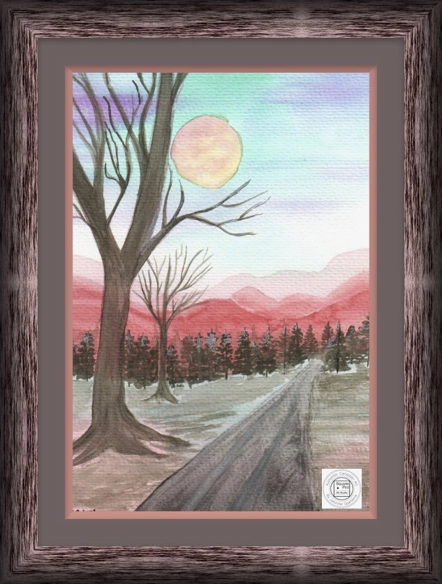 This early winter landscape evokes the tranquil stillness of a frosty evening. A blue and purple twilight sky fades above distant red hills, touched with hints of brown and green, creating a peaceful yet chilly atmosphere. The moon, rising slowly, adds a quiet luminosity, signalling the day's end. Inspired by the familiar view of distant hills, the painting offers a comforting connection to the warmth of home, while celebrating the solitude of a rural winter setting.