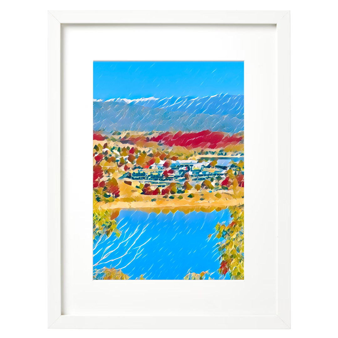 Digital edit photograph of Lake Jindabyne and Snowy Mountains taken from East Jindabyne vantage point. The edit is a bright pop art style, and is part of a series of similar photographs. This print is A4 size and framed in a white frame with white matting.
