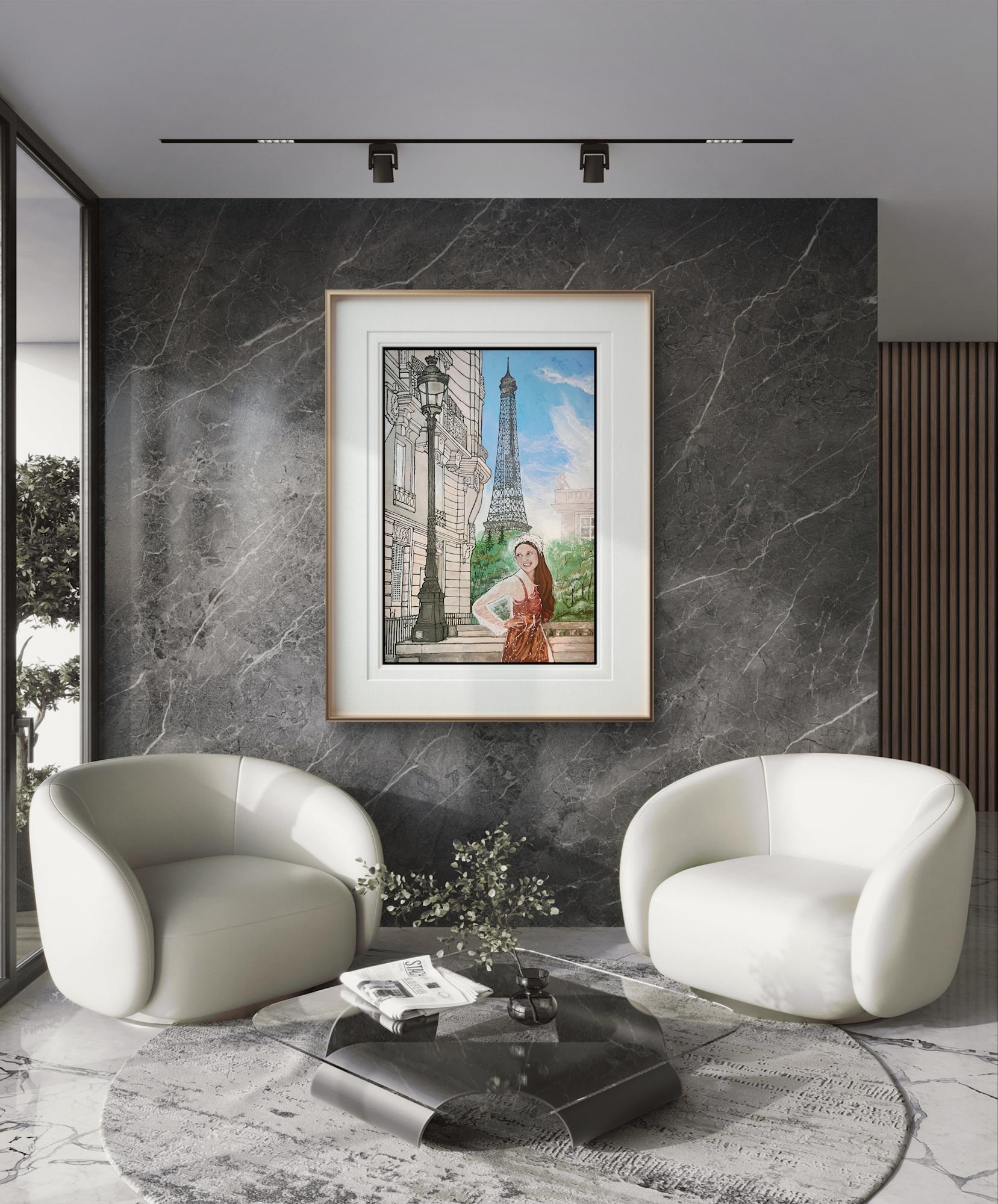 This piece reflects a joyful presence within a timeless cityscape, inviting viewers to share in a moment of grace and spirited elegance. The artwork combines detailed realism with an engaging vibrancy, offering a fresh perspective on familiar Parisian imagery through a distinctly personal lens.