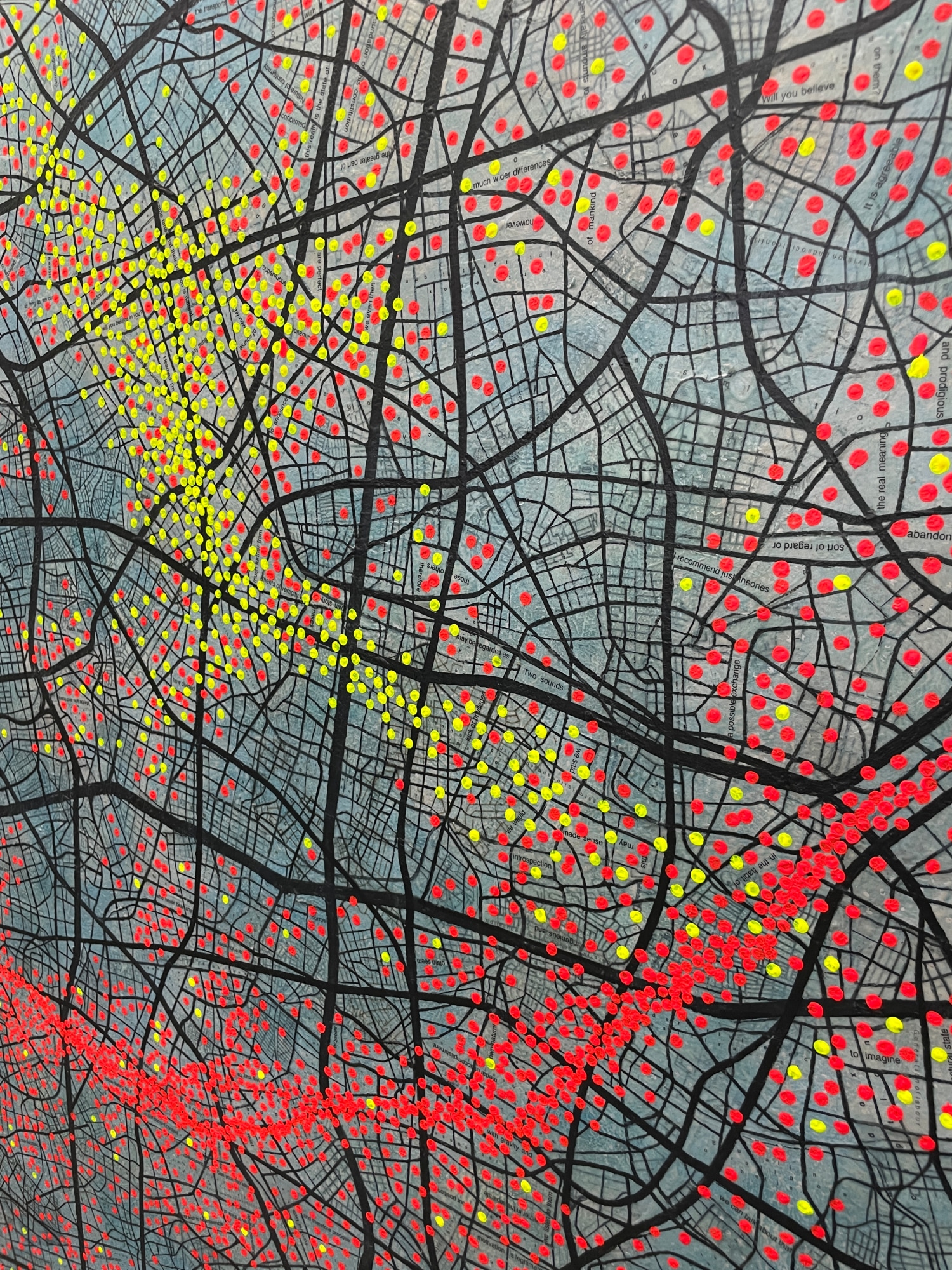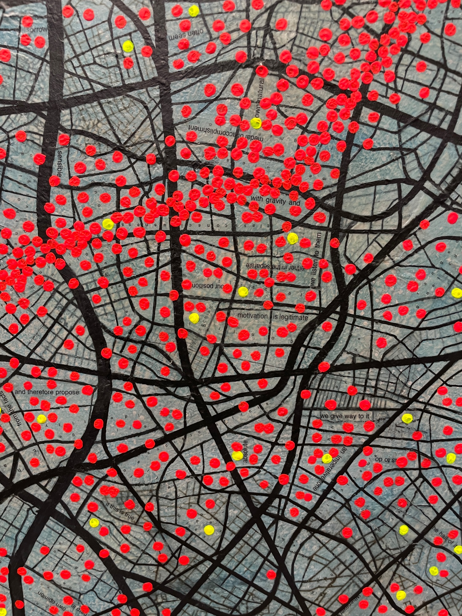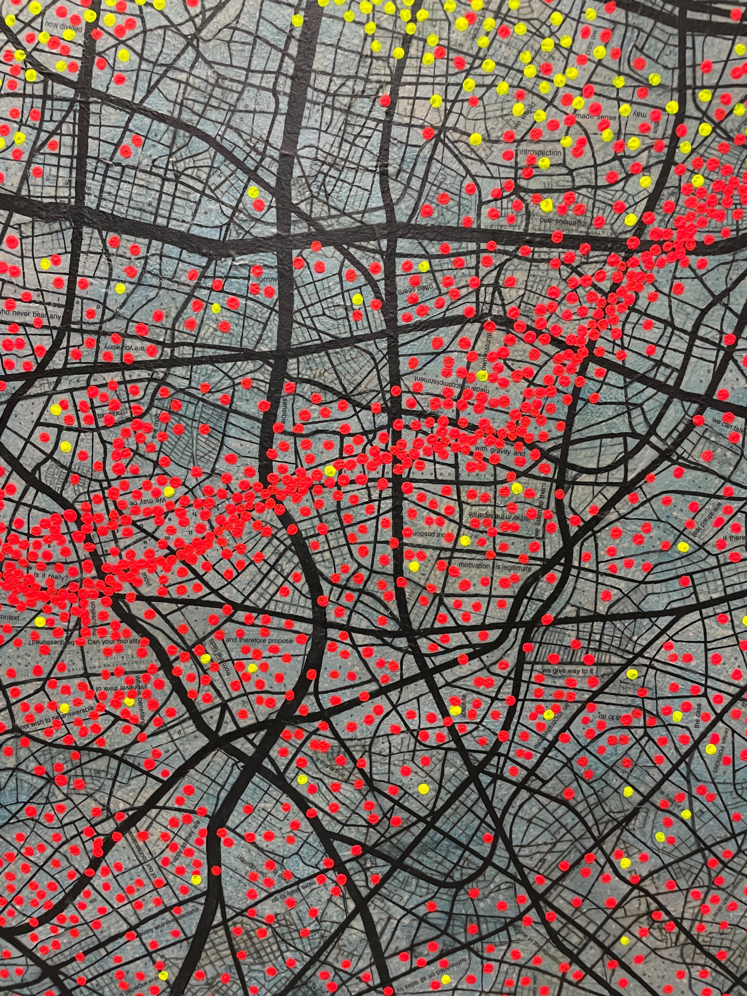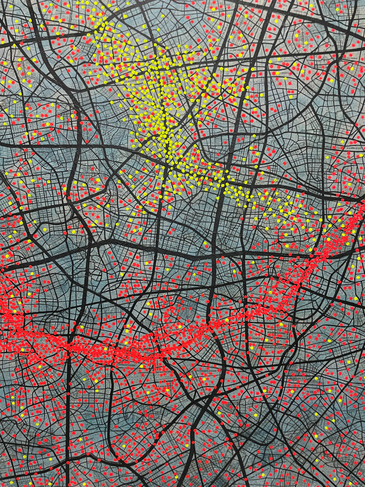 pragmatic. this work highlights clustering in certain areas where I a puzzle of metaphors and contradictions of thoughts guide the intentions of those included on the red spots.while leaving other regions sparsely populated. The red spots serve as a visual metaphor for the pulsating energy of human activity, symbolizing the lifeblood of the city.