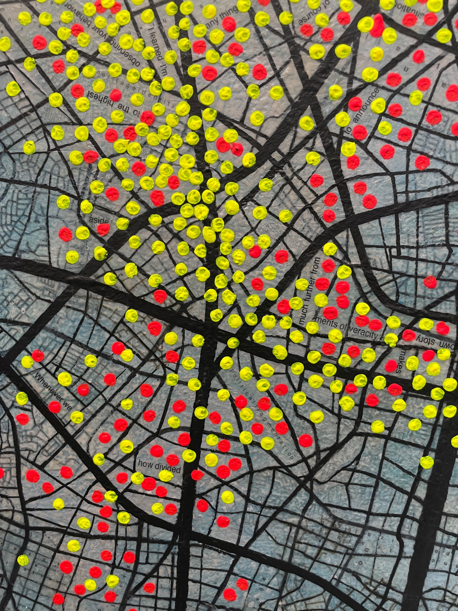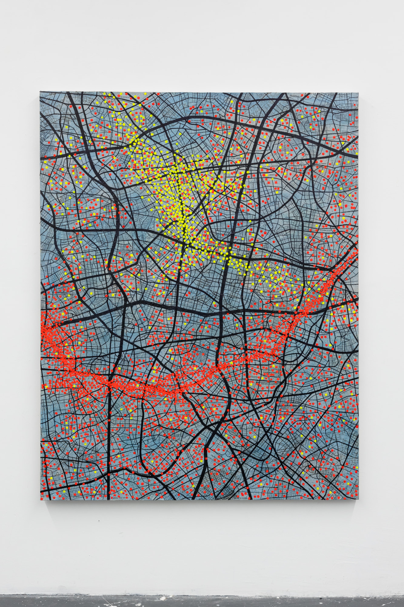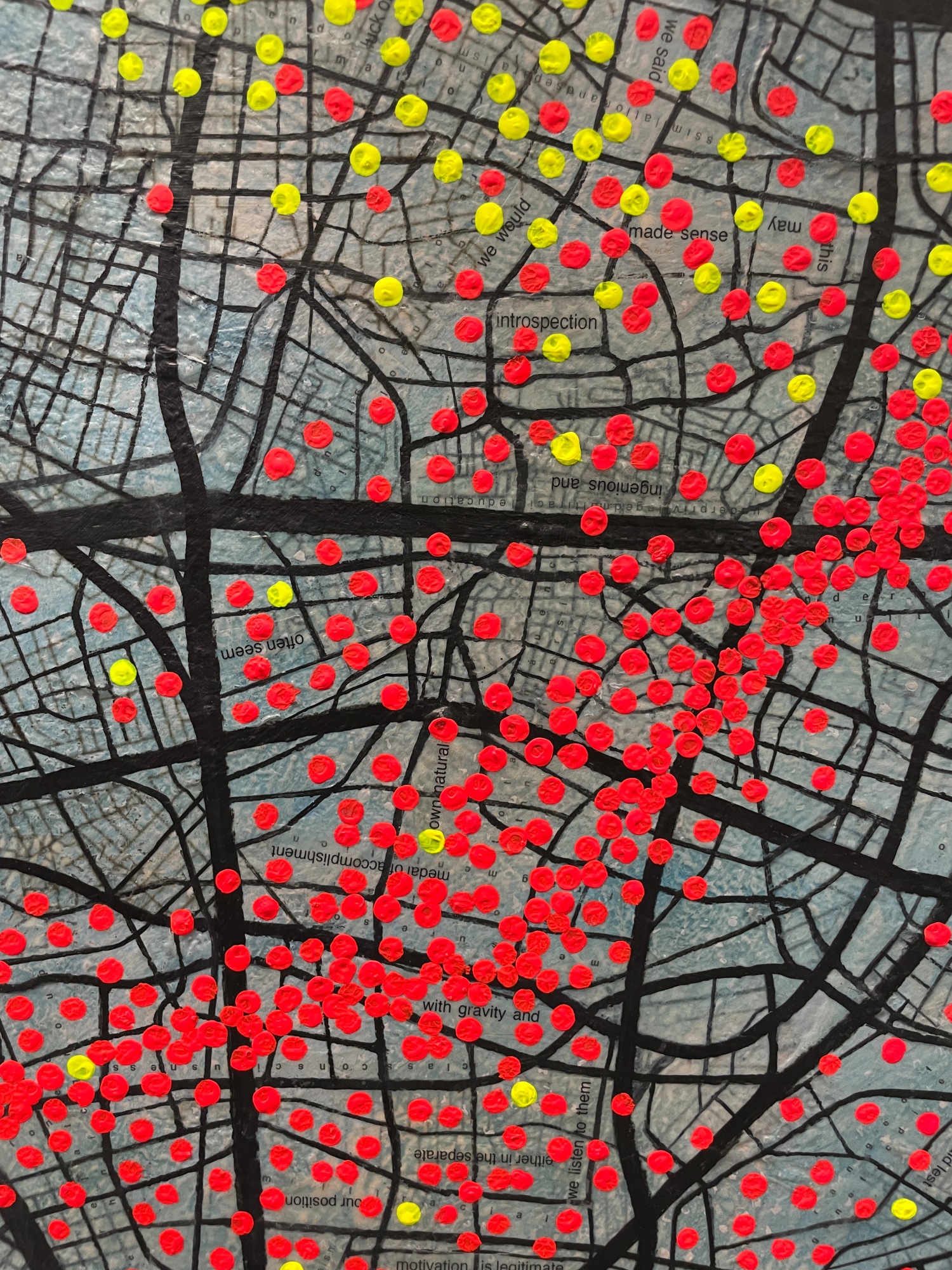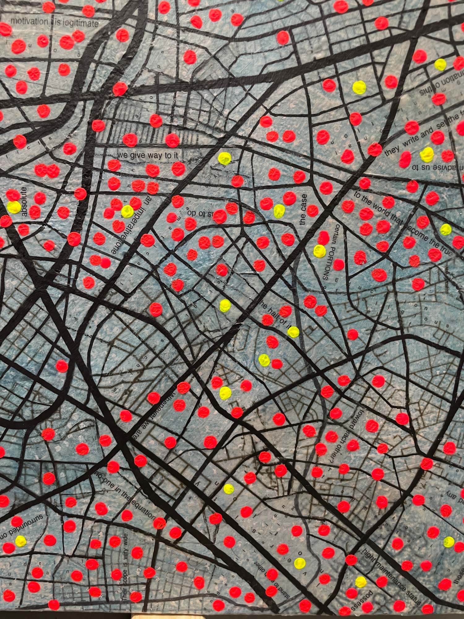 pragmatic. this work highlights clustering in certain areas where I a puzzle of metaphors and contradictions of thoughts guide the intentions of those included on the red spots.while leaving other regions sparsely populated. The red spots serve as a visual metaphor for the pulsating energy of human activity, symbolizing the lifeblood of the city.