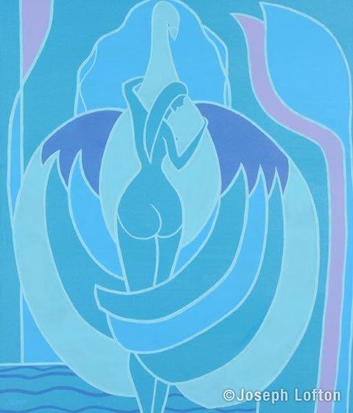 Leda was a beautiful woman, and her beauty attracted the attention of Zeus, who spied her from his throne on Mount Olympus. The beauty of Leda roused Zeus to action, and the god transformed himself into a magnificent swan.The entire work is in shades of blue with a hint of pink. The nude woman, also with her back to the observer, is blue. She still has one arm around the swan’s neck, but in this work the other arm is around the swan’s body. The swan’s wings are in the same position, i.e. one around the woman and in front of her. This time the subjects appear to be standing in water.