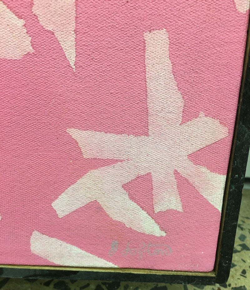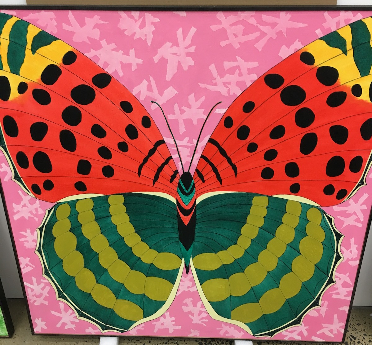 Light magenta background with paler magenta star shapes resembling asterisks; butterfly's upper wings are coral pink, yellow, and phthalo/viridian green with black spots; lower wings are medium phthalo/viridian green with light green-gold "stripes" that consist of connected circular shapes.