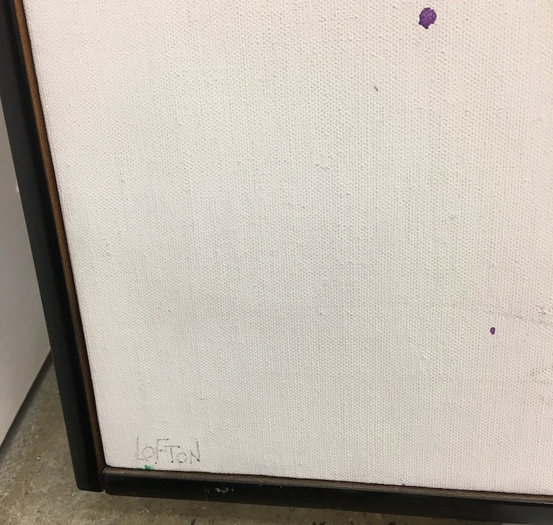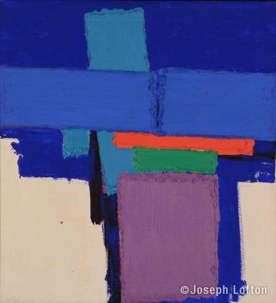 Top half consists of a background that is ultramarine blue on the top half and light grey on the bottom containing rectangles of cerulean and teal blue, light permanent green, vermilion, and medium violet with one horizontal and two vertical dark blue or black strokes.