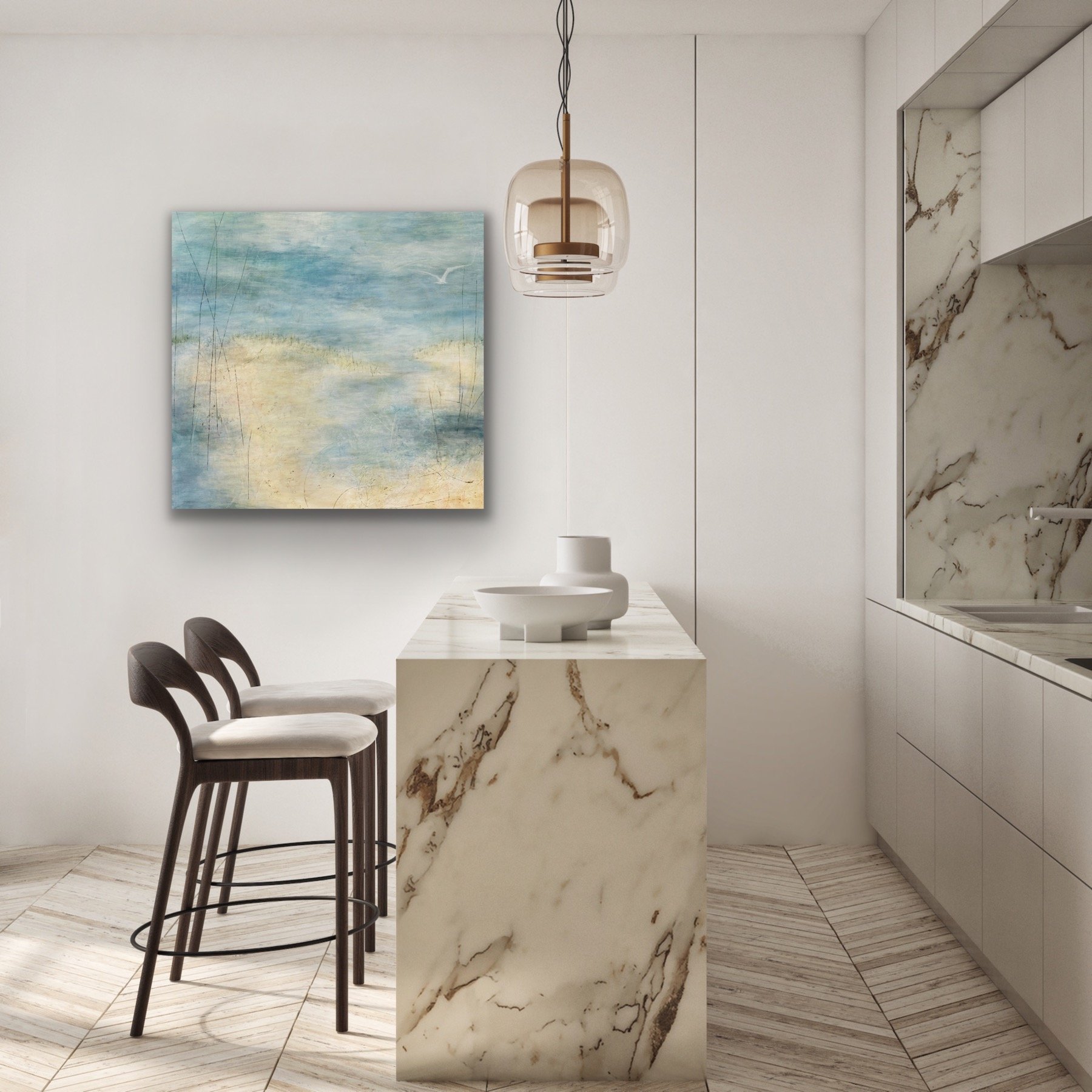 The serene intersection of ocean and sand. Timeless tranquility. Walking on the wet sand on the edge of the beach early in the morning when people haven’t arrived is my ultimate. The gradual rising of the sun kisses the ocean with warm tones of hello. One seagull is scoping out the area with its quiet distant cry. With this painting, I can almost hear the quiet sound of the sea, lost in the moment.