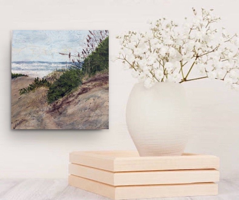 With its soft palette of sandy neutrals, fresh greens, and ocean blues, this composition evokes strength, movement, and serenity all at once. It is a portrait of nature’s balance—wild yet grounding, ever-changing yet timeless. The raw beauty of the coast invites reflection and a deep connection to the sea.
