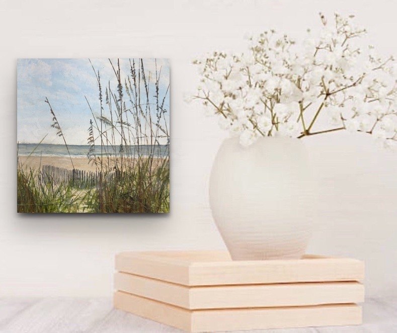 Step into a moment where time pauses and peace settles in. This coastal painting invites you to breathe deeply and remember the quiet joy of standing barefoot in the sand, watching the sea oats dance gently in the breeze. The weathered fence leads your eye, not as a barrier, but as a quiet guide toward freedom and stillness—toward the endless rhythm of the waves beyond.