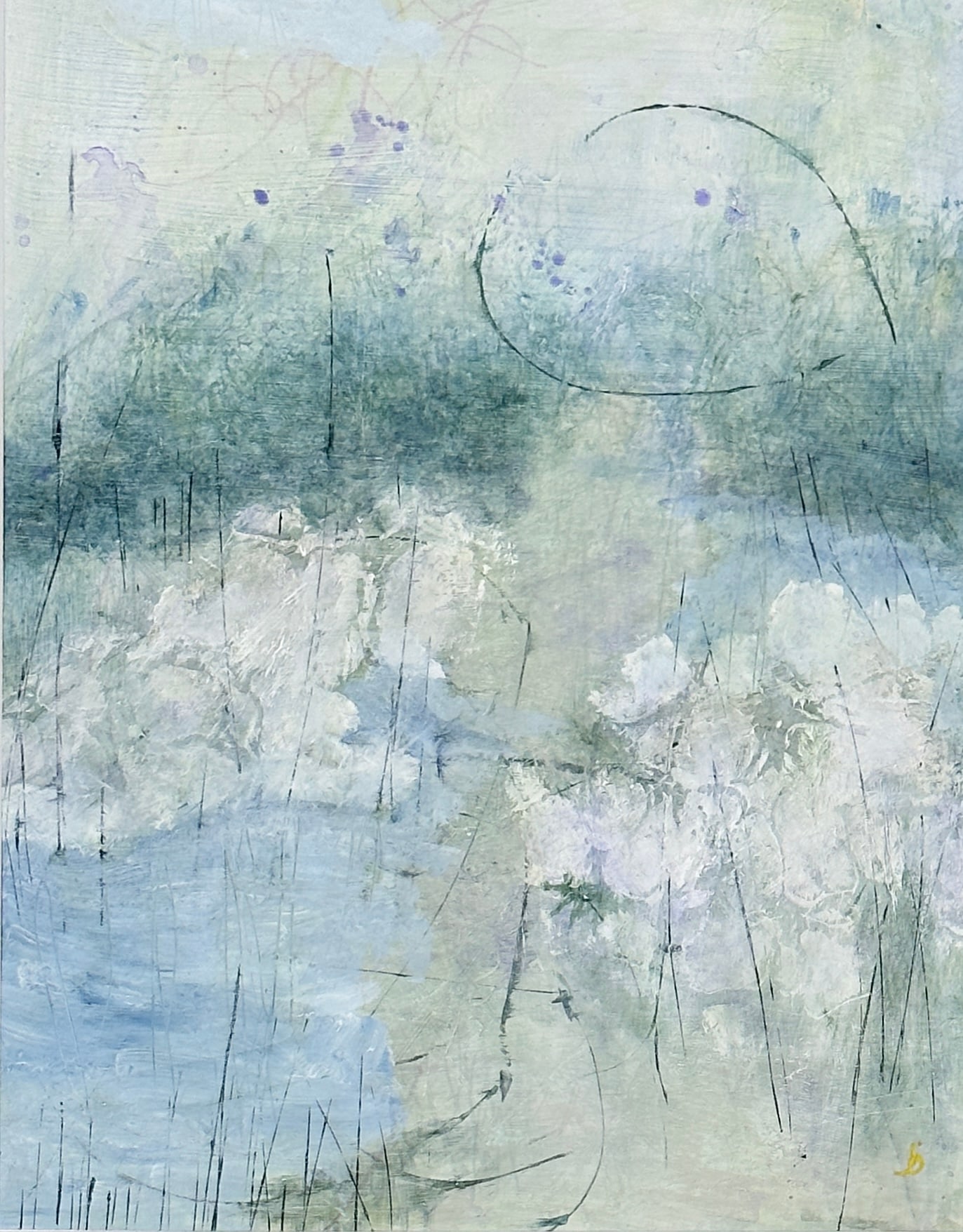 An insinuated landscape of a moment of reprieve by a gently flowing river with blooms along its edge.
