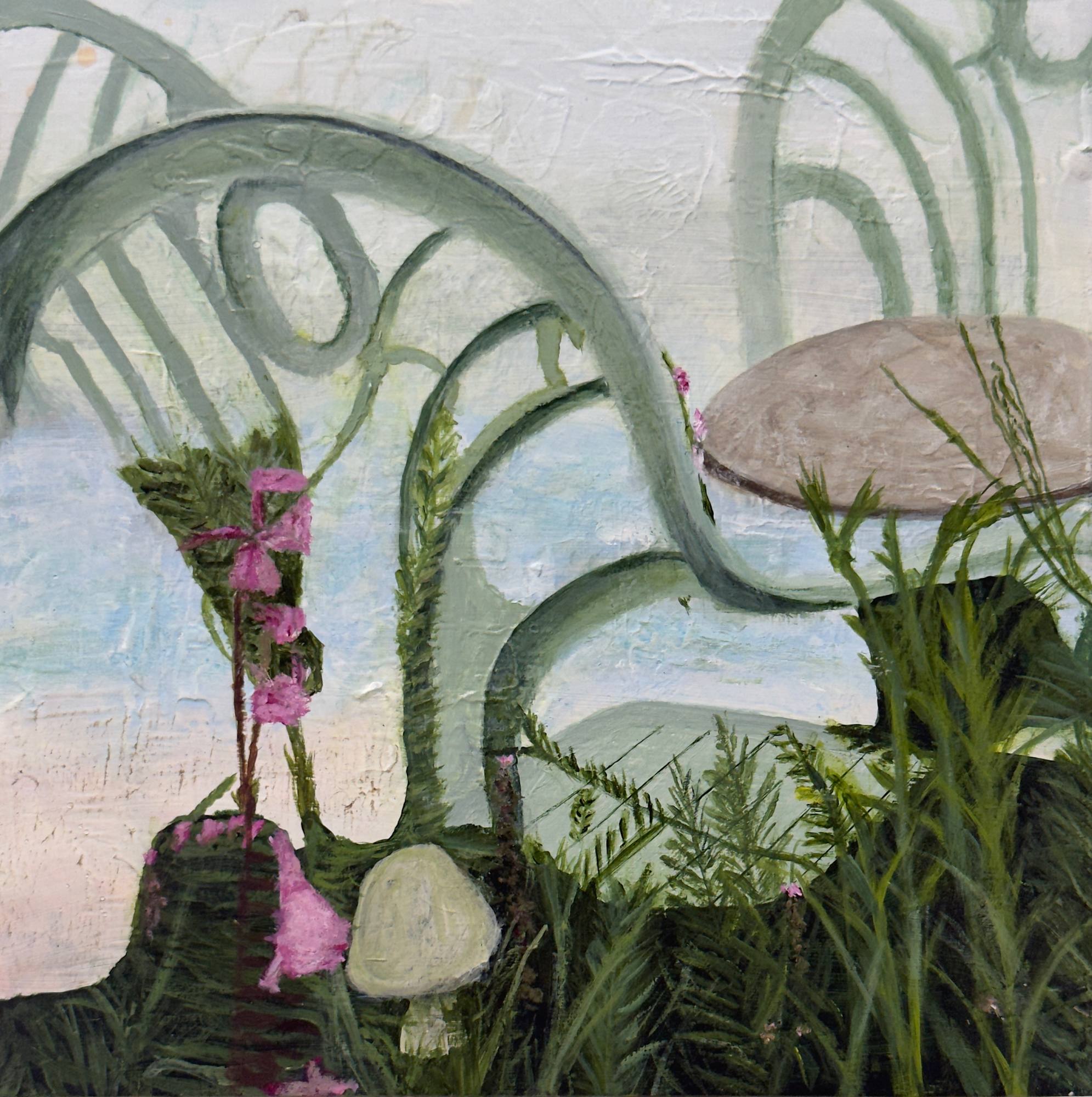 In this abstract painting, time seems to pause—caught between presence and memory. The soft green curves of the café chairs rise gracefully among wild blossoms and feathery ferns, as if nature herself has pulled up a seat. The weathered tabletop, once a resting place for conversation and laughter, now gathers quiet light and petals, becoming a sanctuary for stillness.
