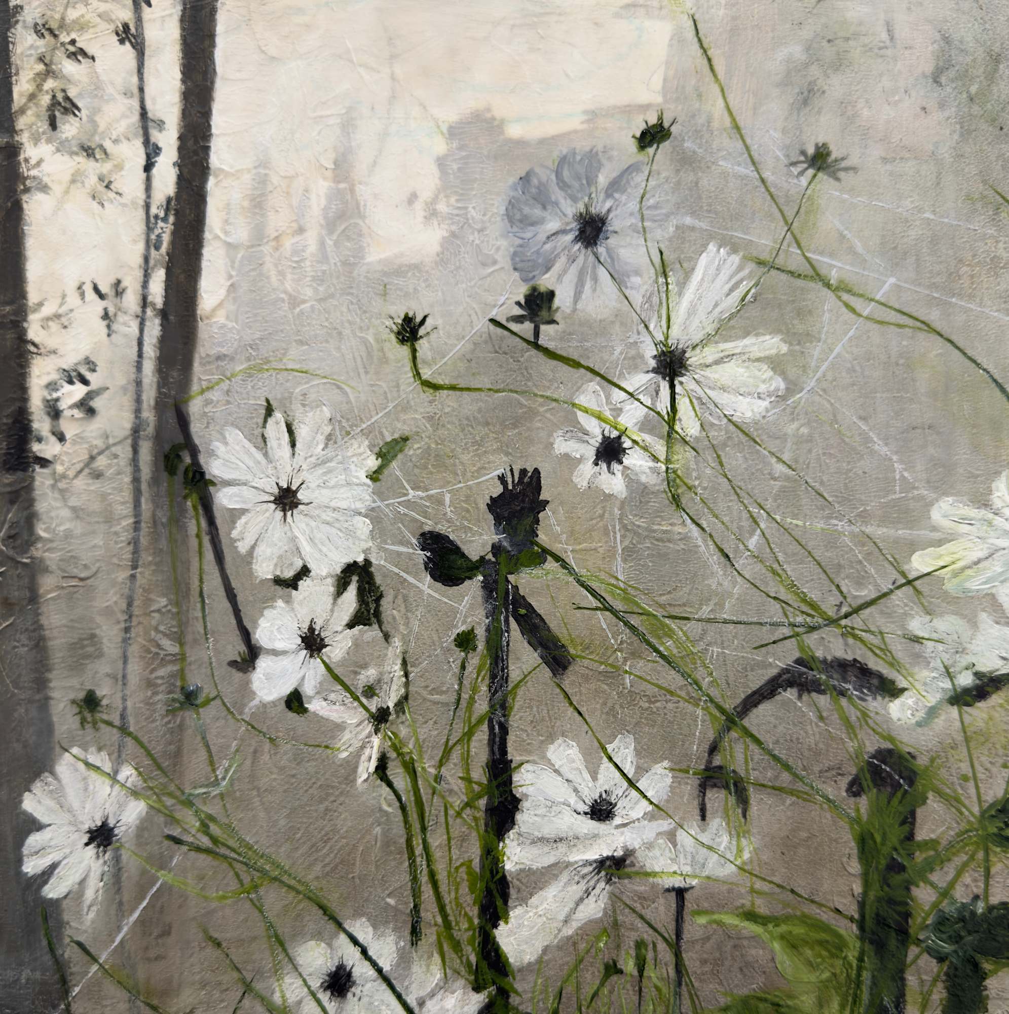Enjoy a moment suspended in mist. Dew-covered white blossoms stretch toward the morning light, each petal kissed by cobweb threads that glisten like spun silver. The soft fog embraces the background in a dreamy blur, letting the flowers step forward as quiet heroes of the scene. Their beauty is fragile, fleeting, and absolutely unforgettable.