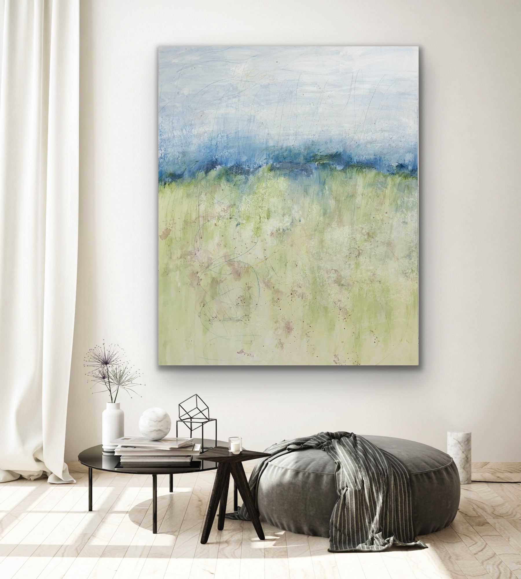 This piece evokes serene calm, blending the whispers of a breezy meadow with soft horizon hues. Abstract green and blue strokes create an impressionistic landscape, inviting a peaceful, dreamlike state. Subtle textures and faint marks suggest rustling grass and delicate light, capturing the timeless tranquility of untouched nature.