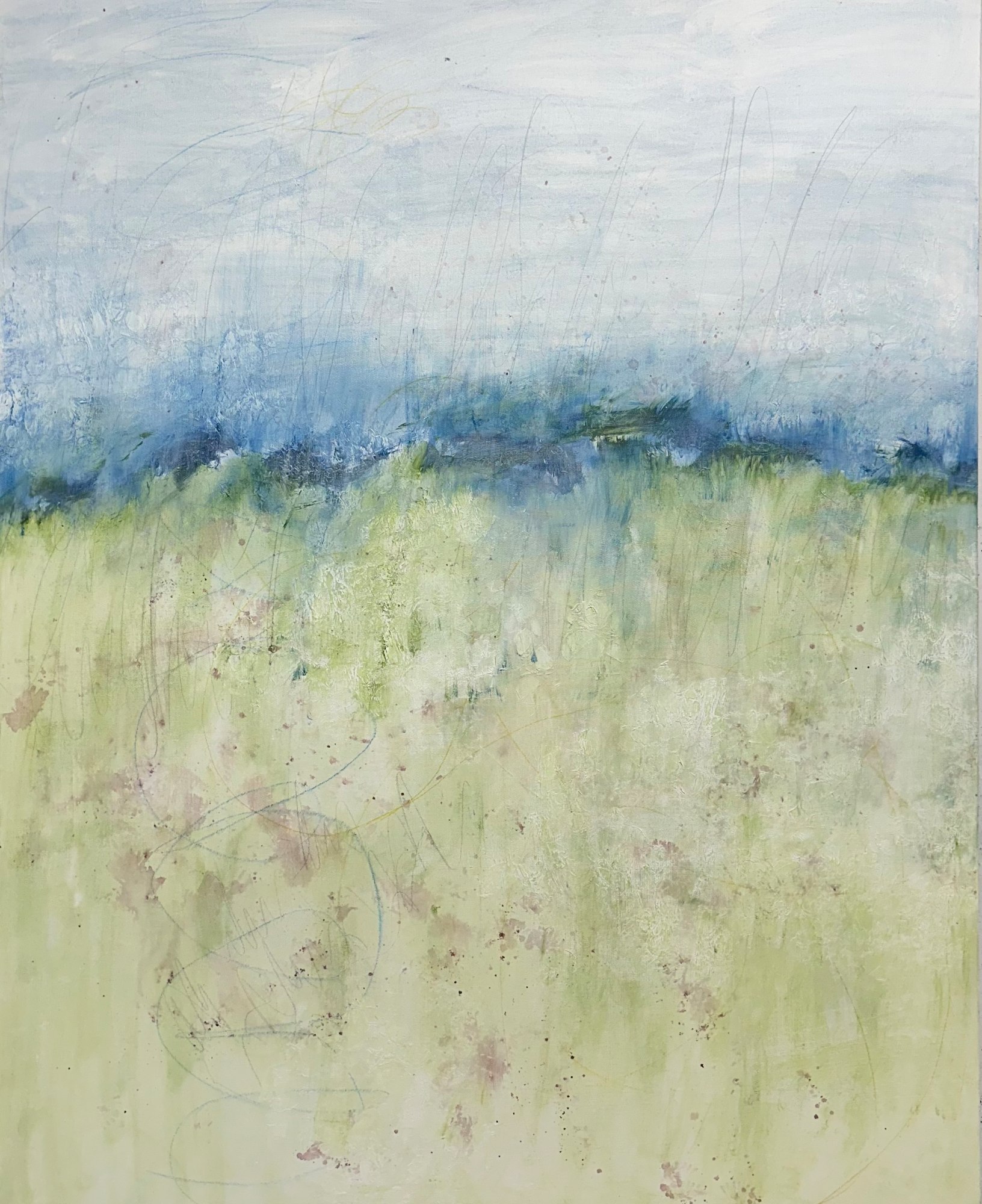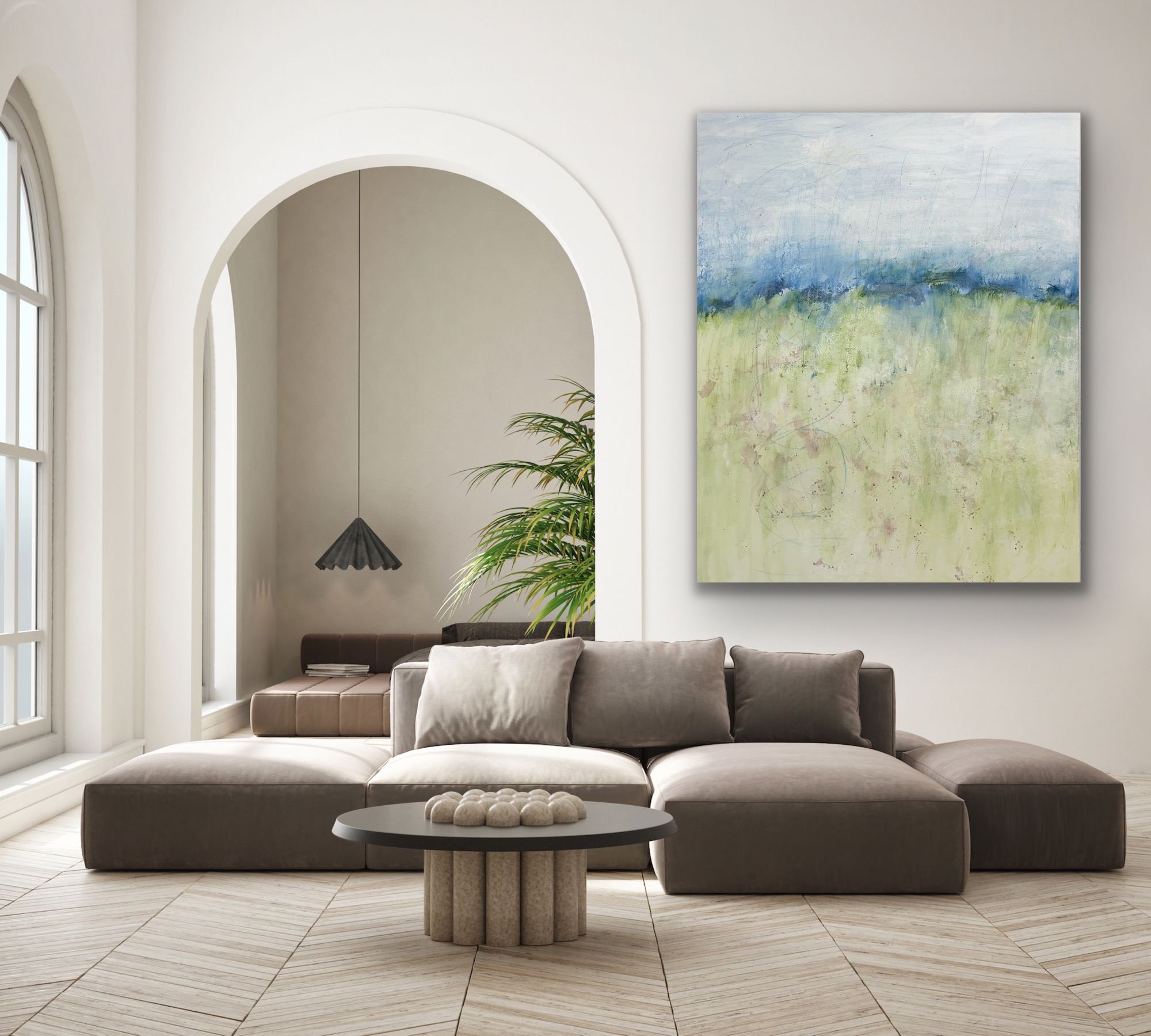 This piece evokes serene calm, blending the whispers of a breezy meadow with soft horizon hues. Abstract green and blue strokes create an impressionistic landscape, inviting a peaceful, dreamlike state. Subtle textures and faint marks suggest rustling grass and delicate light, capturing the timeless tranquility of untouched nature.