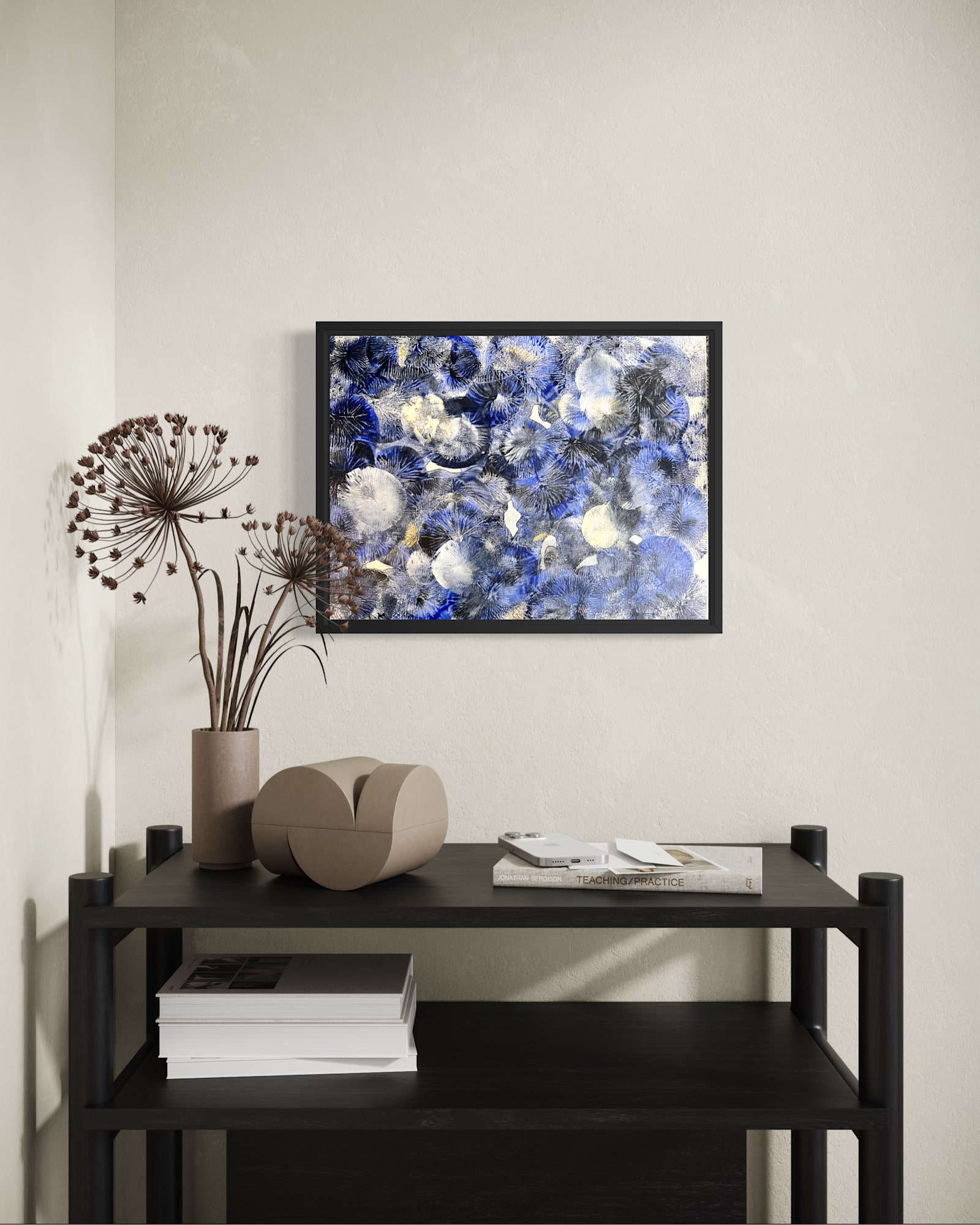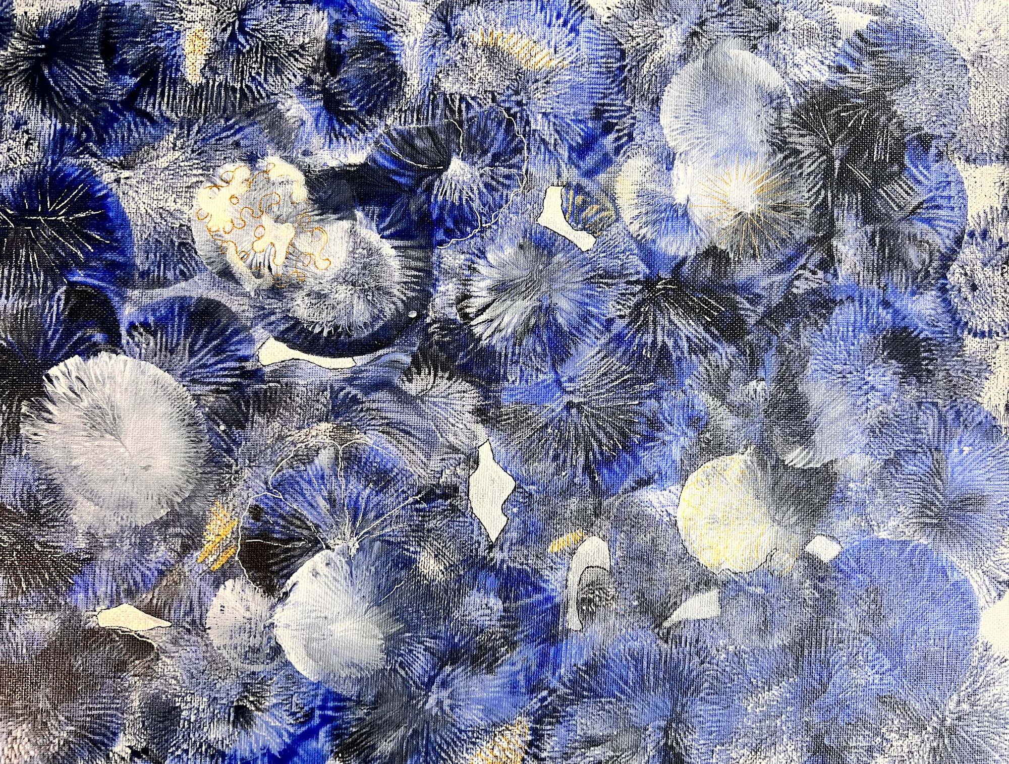 This piece invites the viewer into an immersive atmosphere where forms gather, overlap and dissolve within a shared ground of blue. Both meditative and alive, the painting becomes a reflection on presence, how we emerge, belong, and continually return to the field around us.