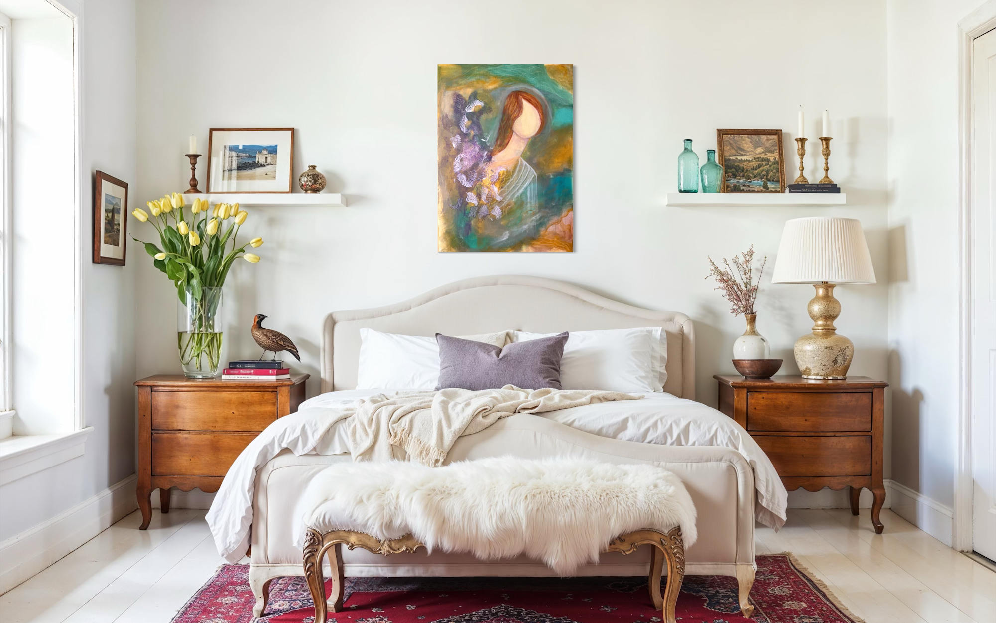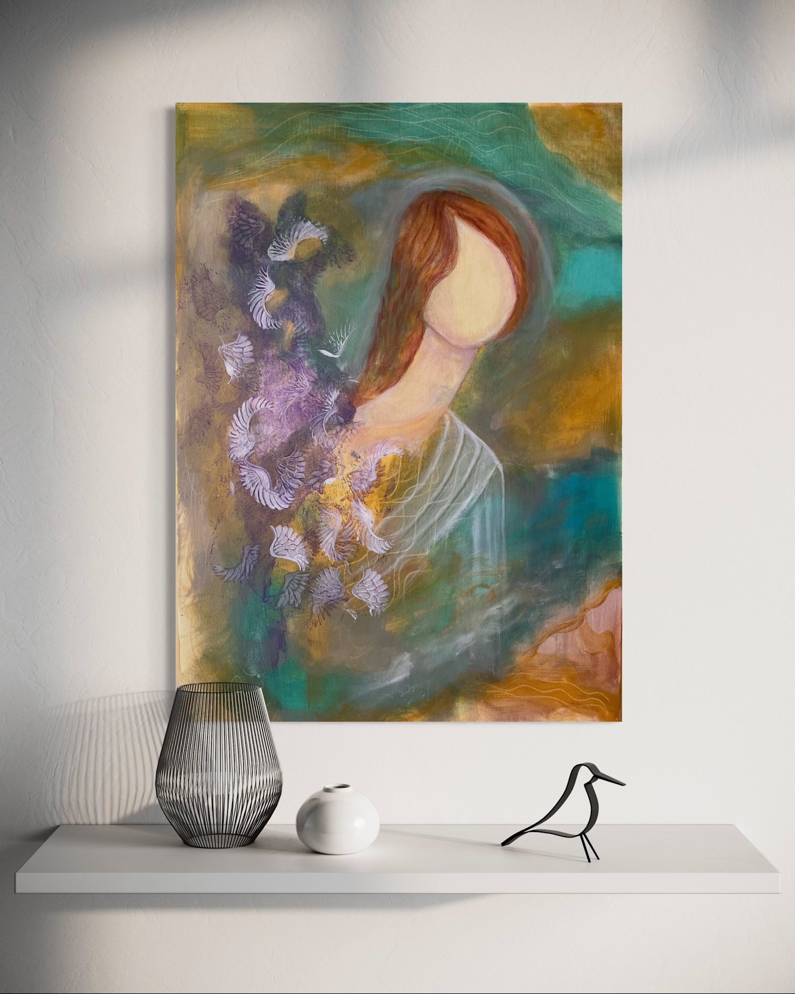 A faceless figure rises from abstraction, surrounded by delicate, wing-like forms that evoke release and transformation. This piece reflects a moment of awakening, a tender passage from introspection to light. Through its fluid textures and serene palatte, Emergence speaks to the beauty of unfolding into one's truest self.