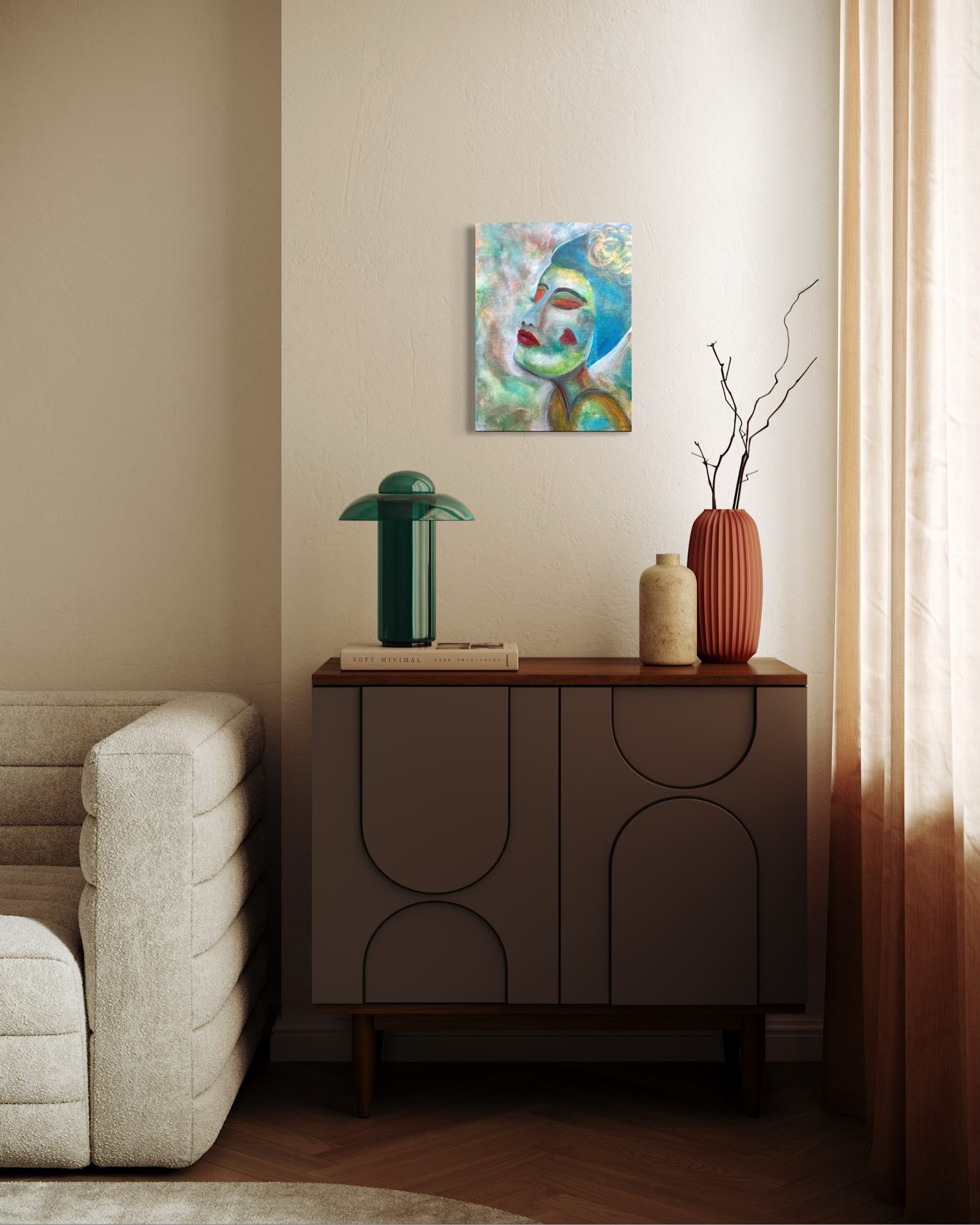 Love Thyself portrays a women in quiet contemplation. Her pose suggest inner healing and self-compassion. Both modern and timeless, this piece invites quiet reflection and a moment of stillness.