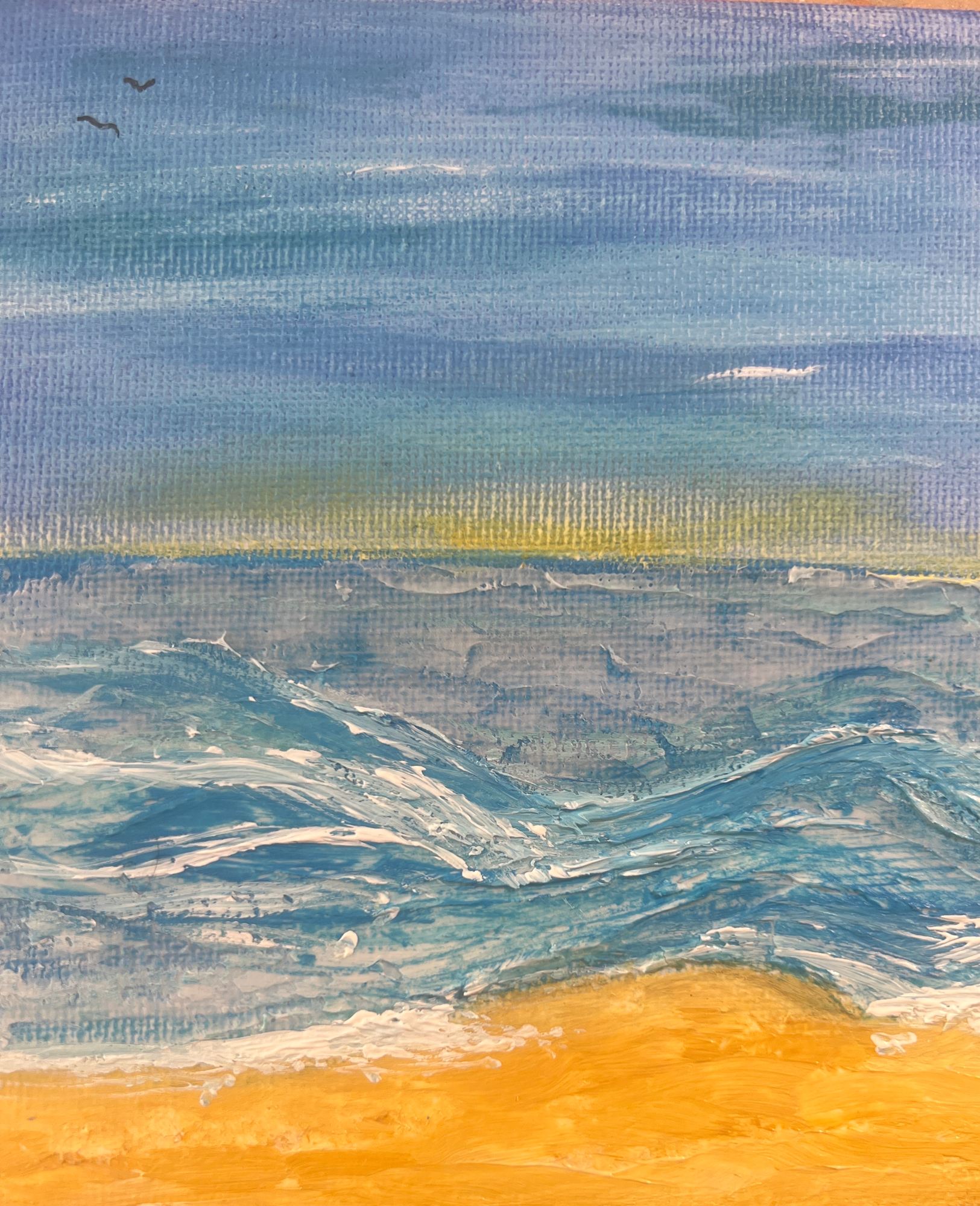 Seabreeze captures the gentle rhythm of ocean waves meeting a sun-warmed shore. Layered blues and soft whites roll across the canvas, suggesting motion without urgency, while a band of golden sand anchors the scene in warmth and light. Subtle hints of yellow along the horizon evoke early morning or late afternoon calm, and distant birds lend a quiet sense of openness. This piece invites the viewer to exhale, an ode to stillness, renewal, and the soothing pull of the sea.
