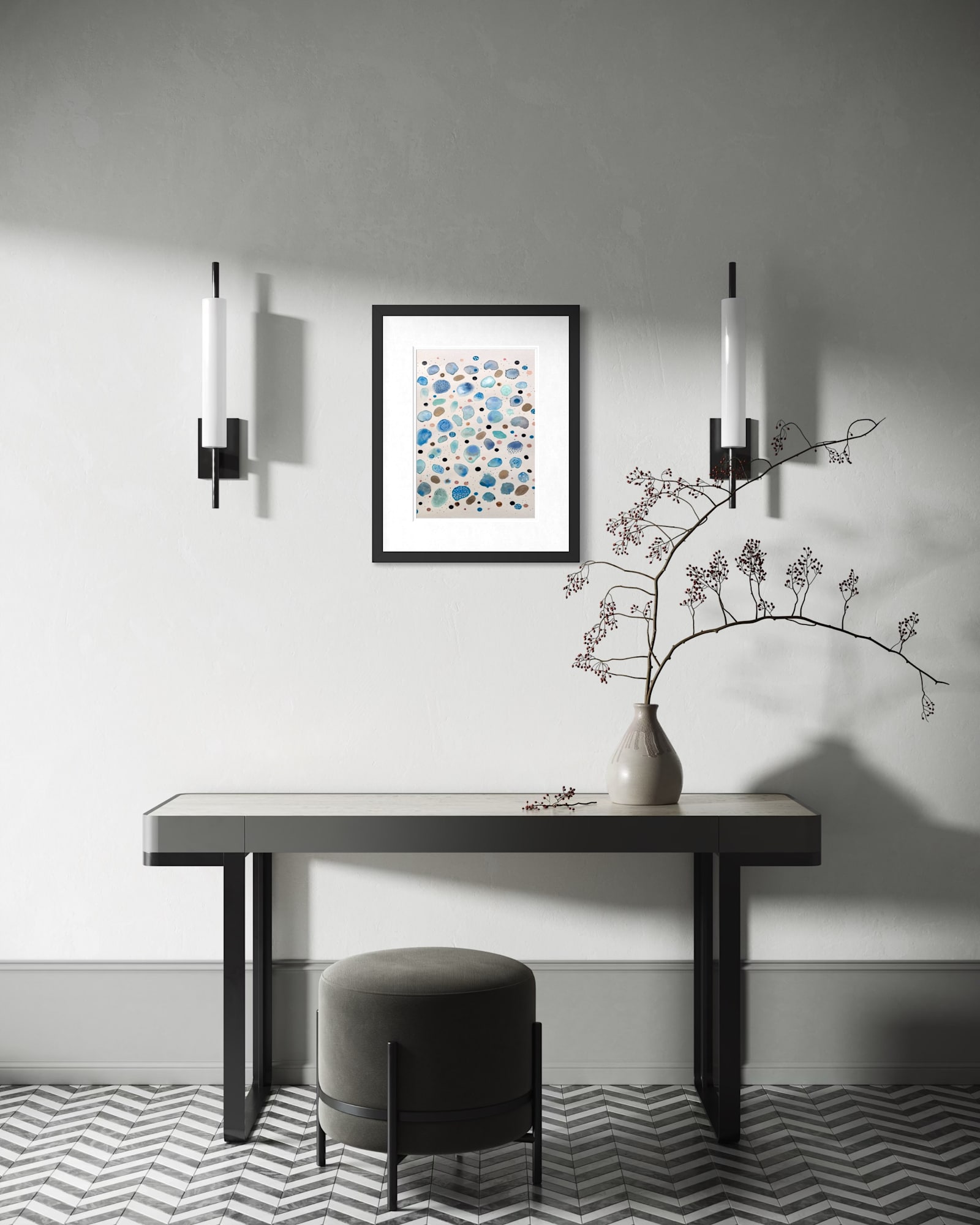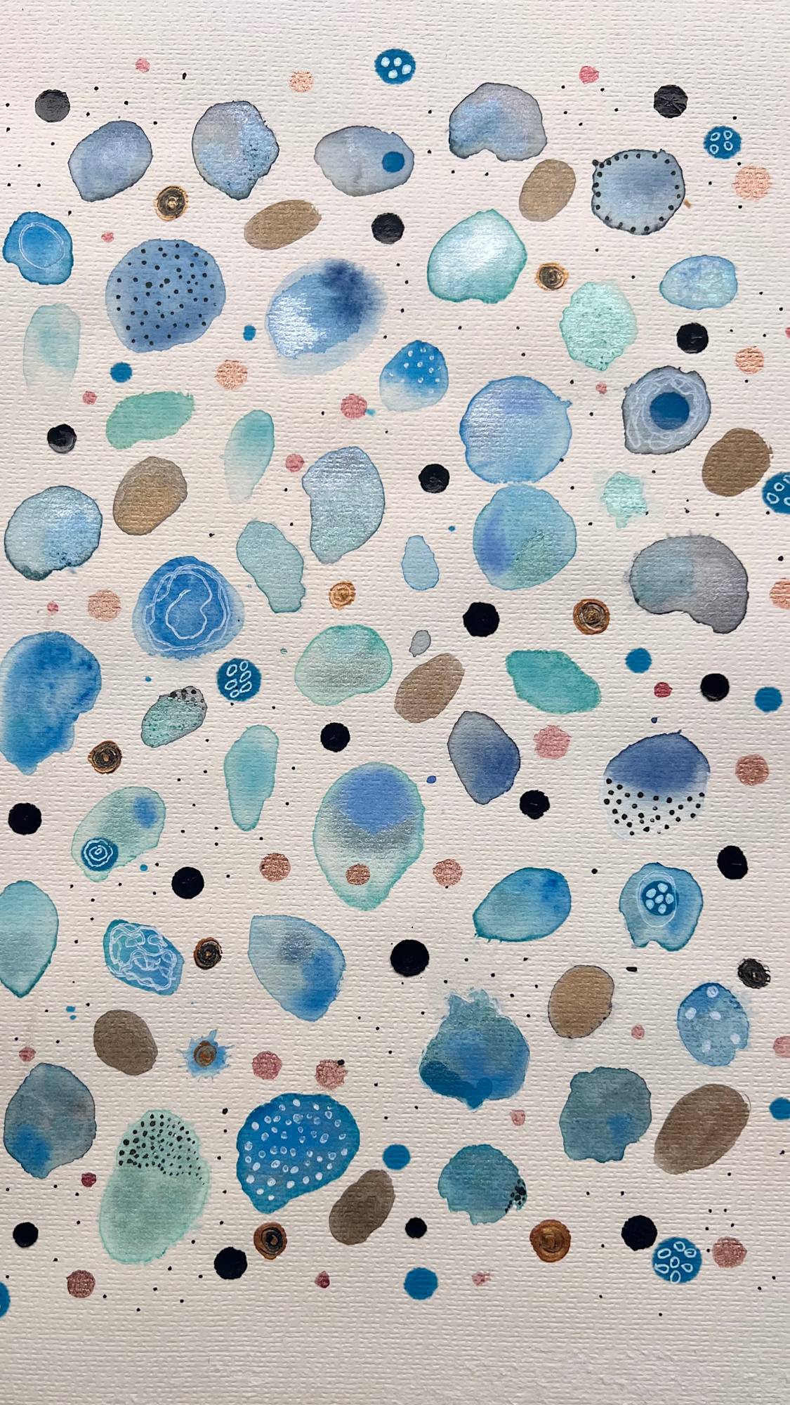 A serene interplay of soft blues, aquas and warm metallics, Tidal Whispers evokes the quiet rhythm of water and breath. Each form feels suspended, a moment of stillness within flow, reminiscent of pebbles beneath clear tide pools or the quiet pulse of life at a cellular level.
