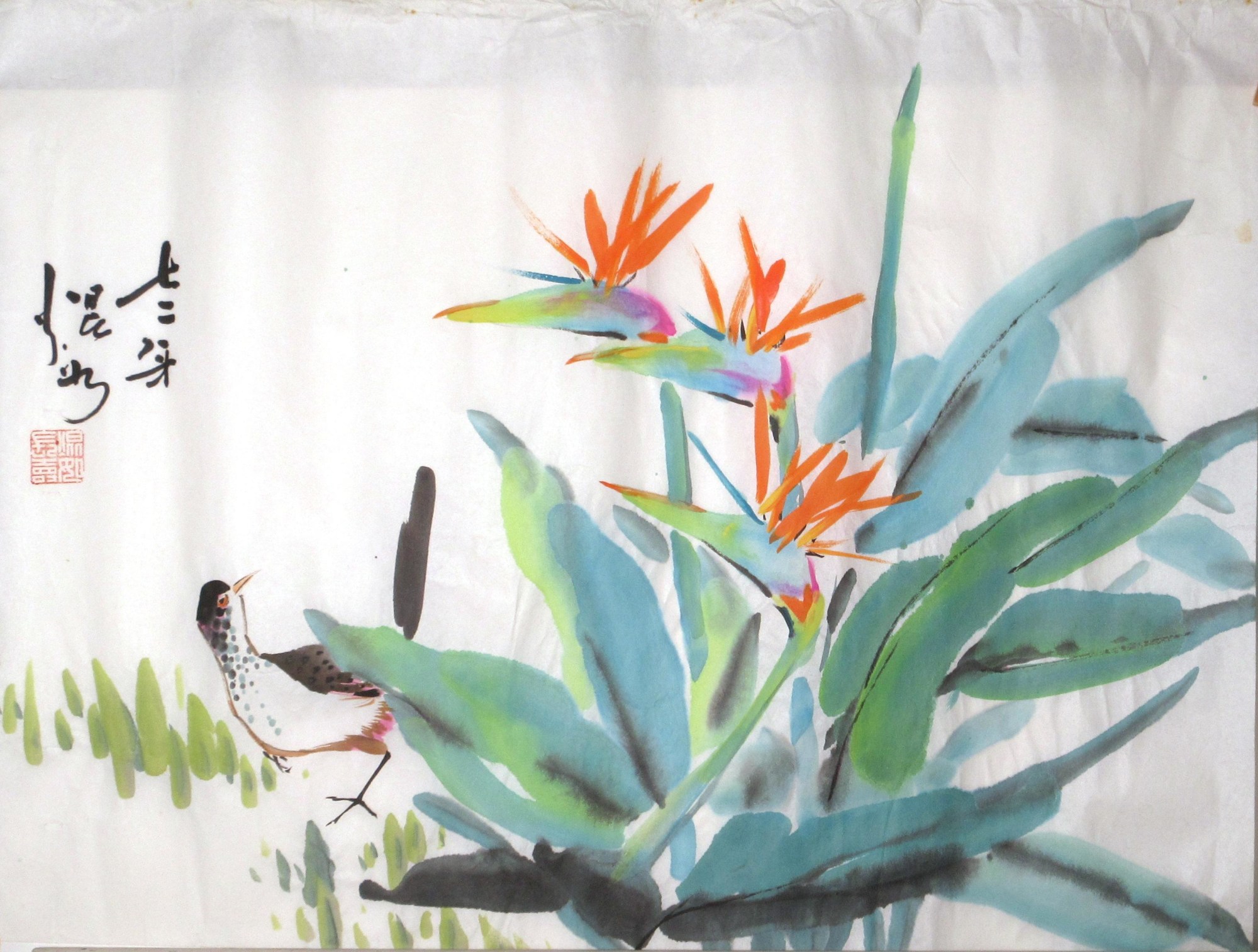 A roadrunner pauses next to a clump of bird of paradise. Unmounted rice paper.