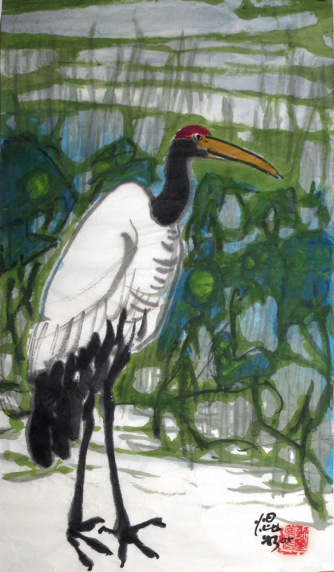A crane wading in water along weeds and other vegetation. Unmounted.