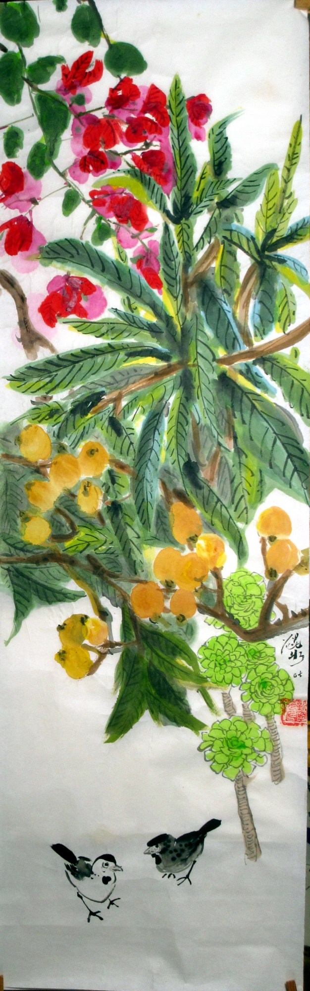 Two sparrows under loquat trees, aonium plants and red coral flower tree. Unmounted.