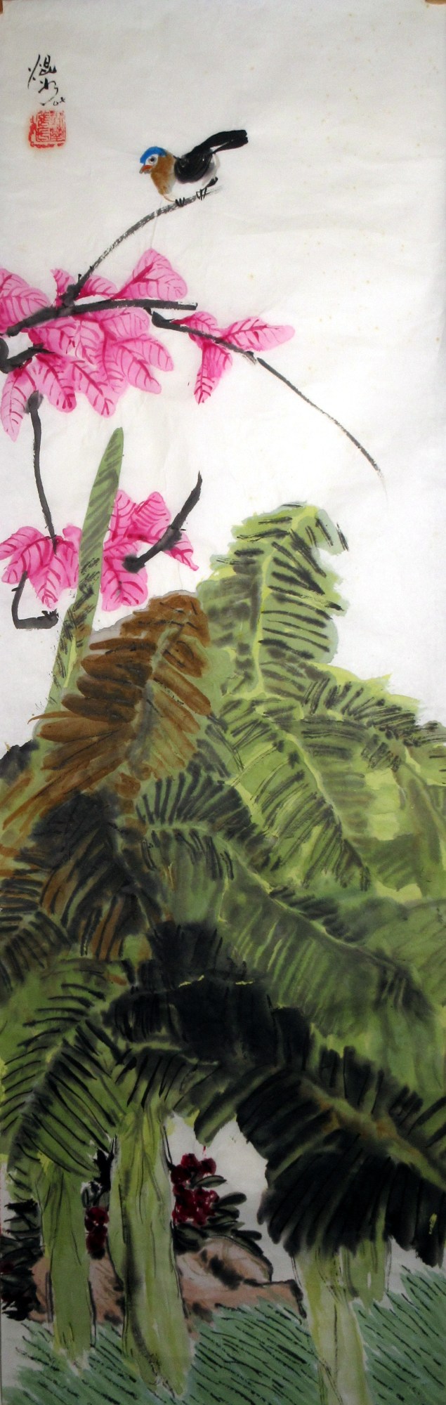 An unmounted vertical painting of a tan and black bird perched on a branch with magenta and pink leaves. In the background stands banana trees with red burgundy colored fruits.