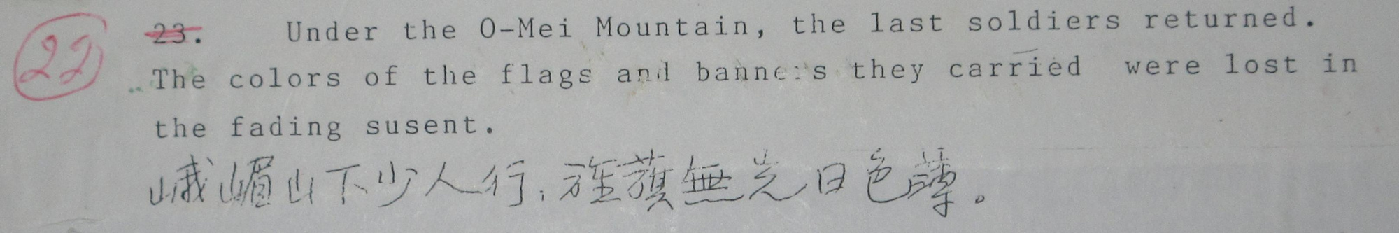 22. Under the O-Mei Mountain, the last soldiers returned. The colors of the flags and banners they carried were lost in the fading sunset.