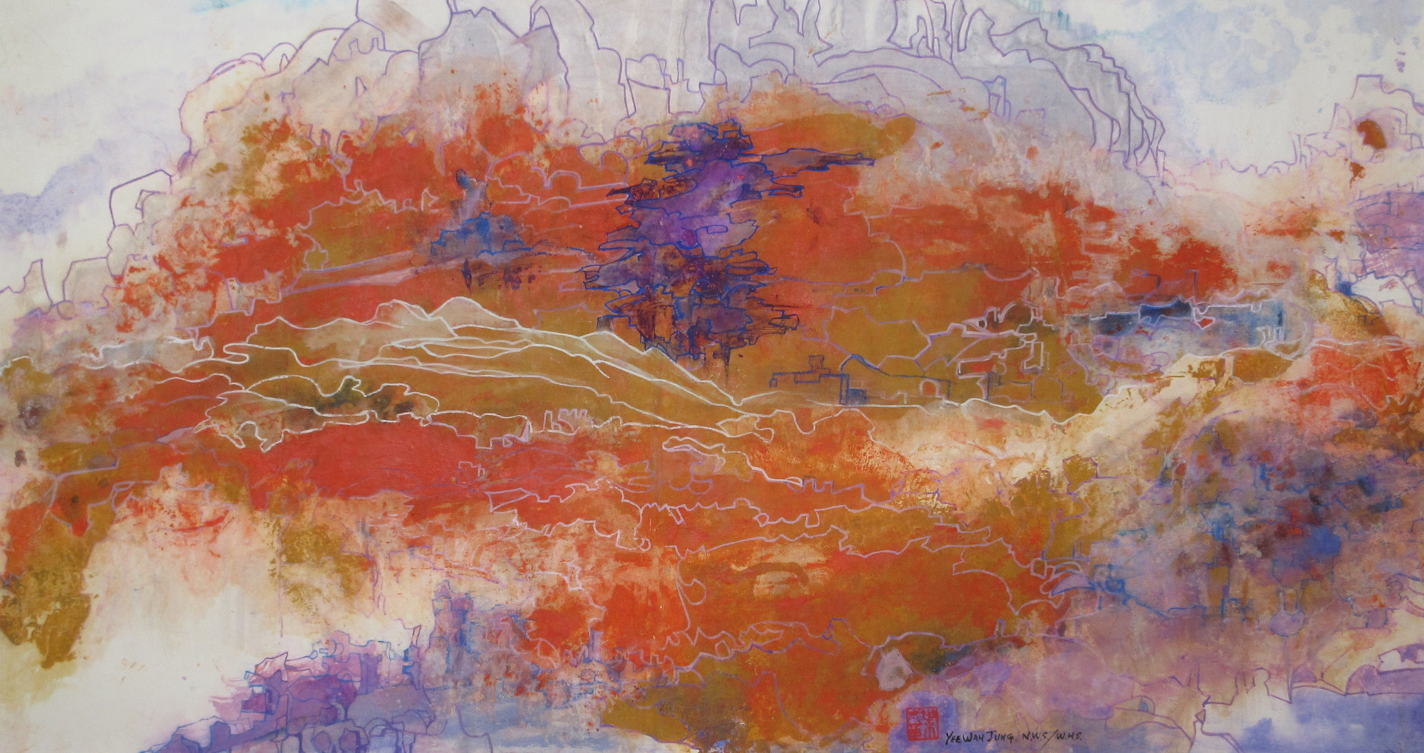 Mounted on watercolor paper. This abstract painting shows red hued rocky areas and purple mountains.