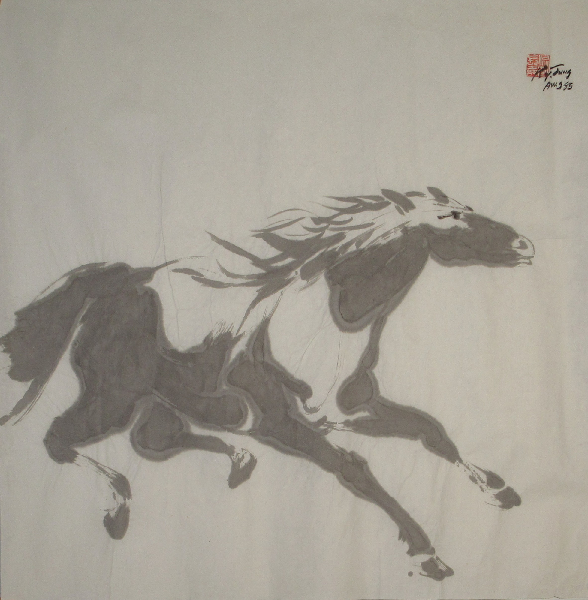 An unmounted rice paper painting of a horse in mid air.