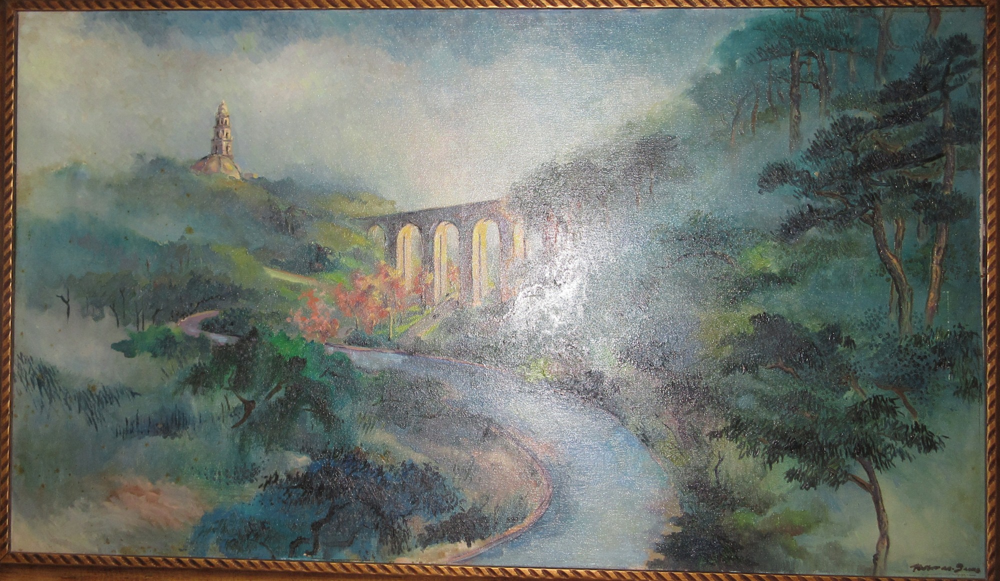 A painting of Balboa Park, California, showing the tower and Cabrillo Bridge. In a lightly carved wooden frame.