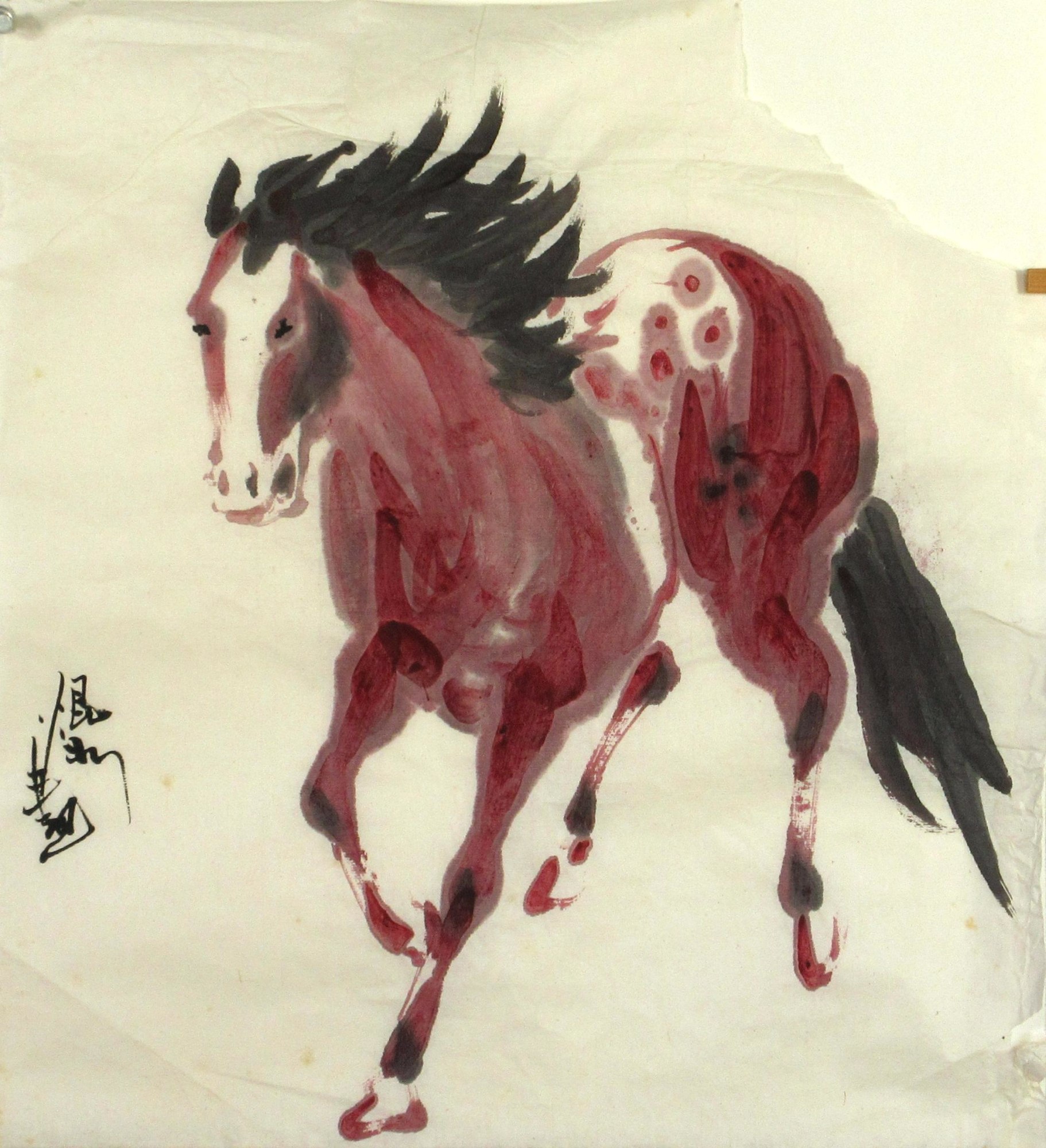 Bay colored Appaloosa horse with white blaze. Unmounted linen paper.