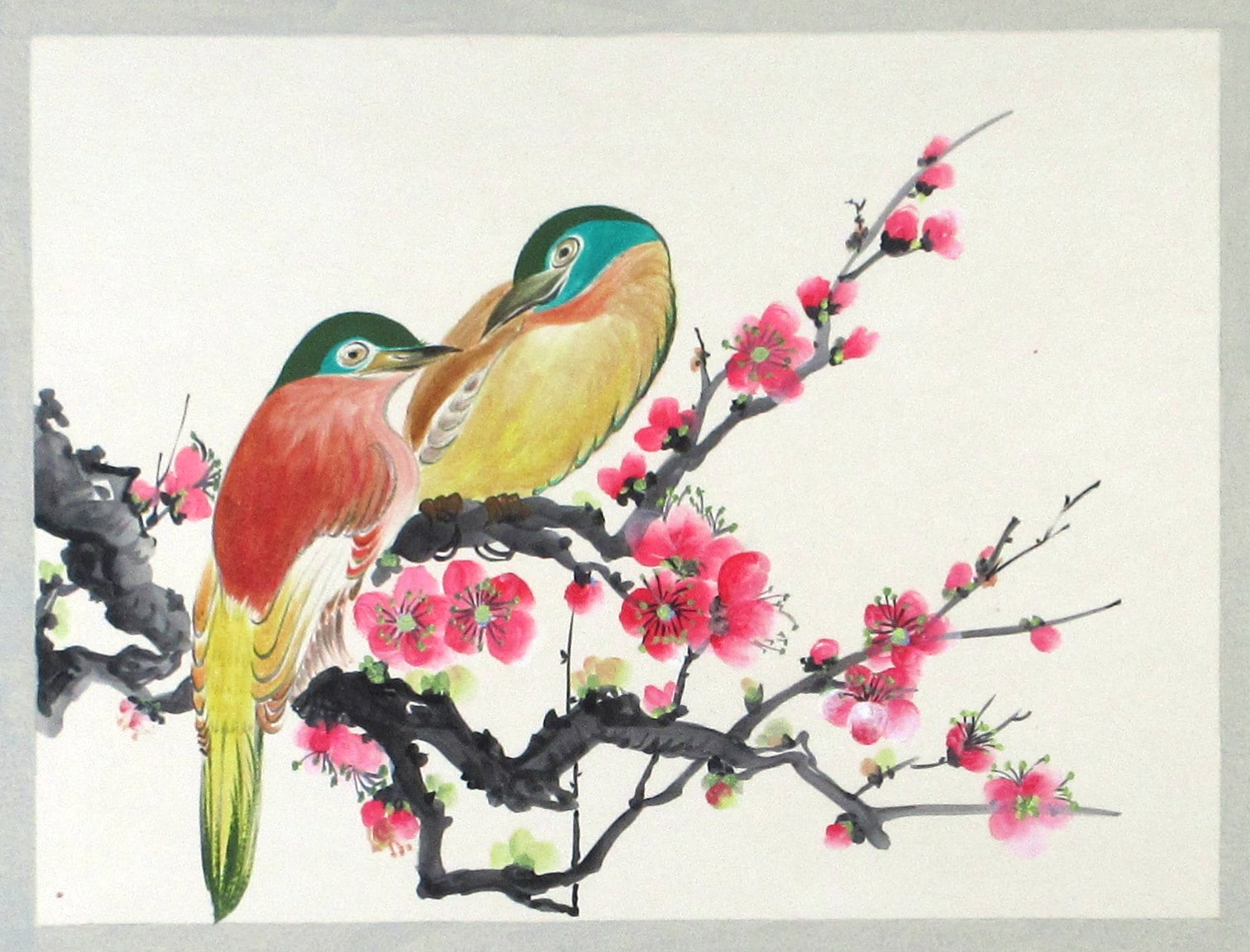 A matted painting of two birds resting on a plum blossom branch. Unframed.