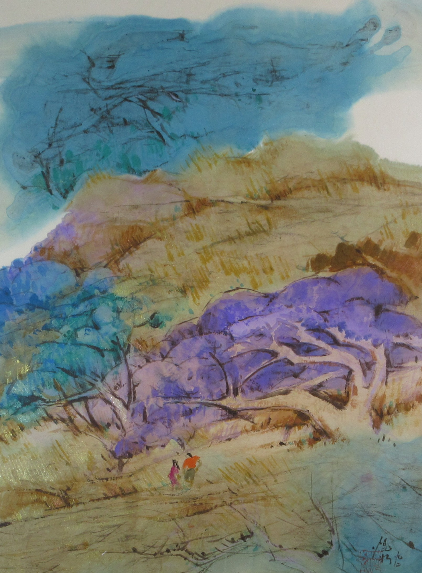 Two figures on a low rise with windswept trees in the background. Mounted on watercolor paper, in a mat board frame, backed by foam core and wrapped in plastic.
