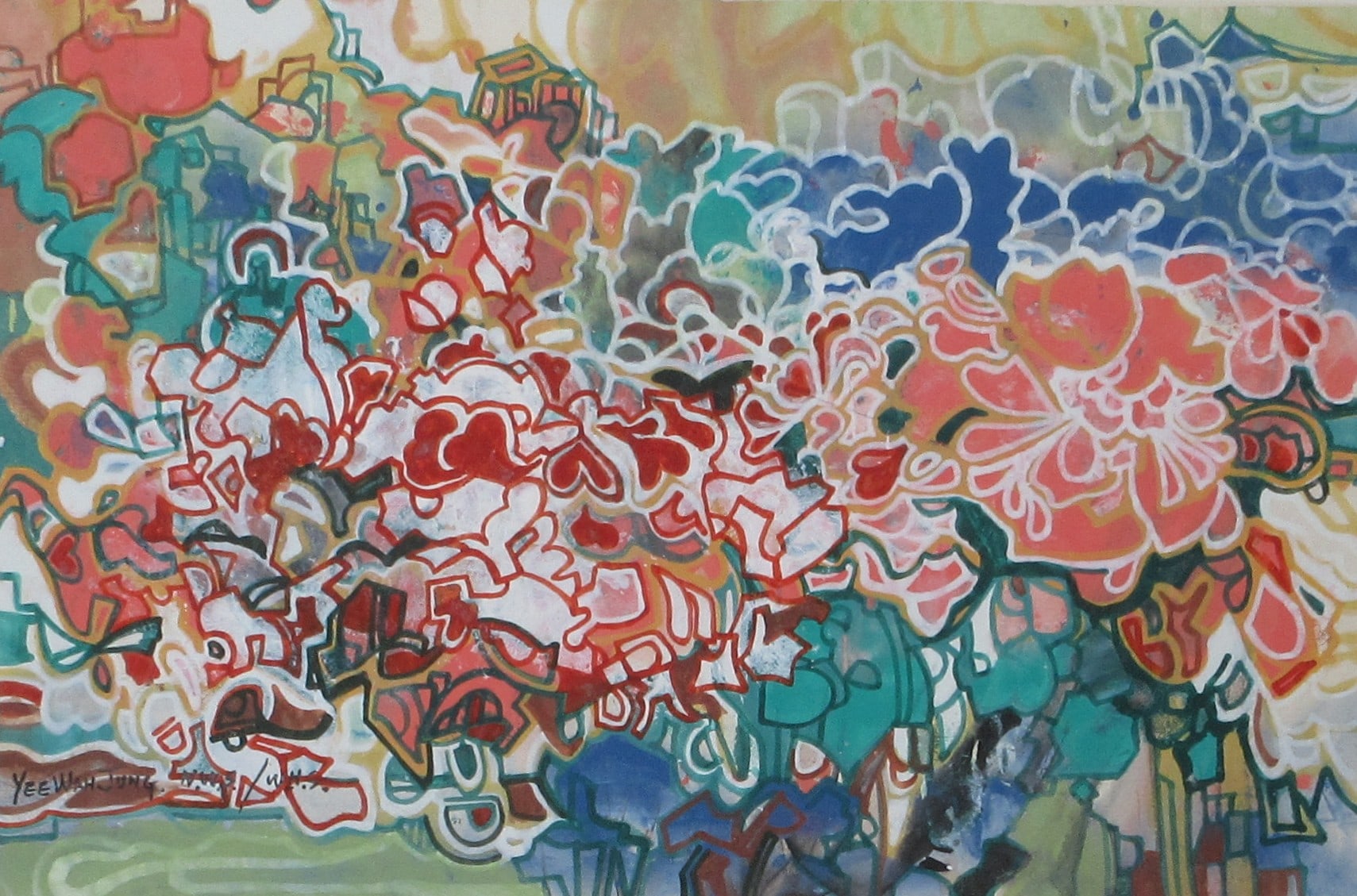 A small abstract painting of flowers, spilling everywhere. Mounted on watercolor paper and a mat board frame.