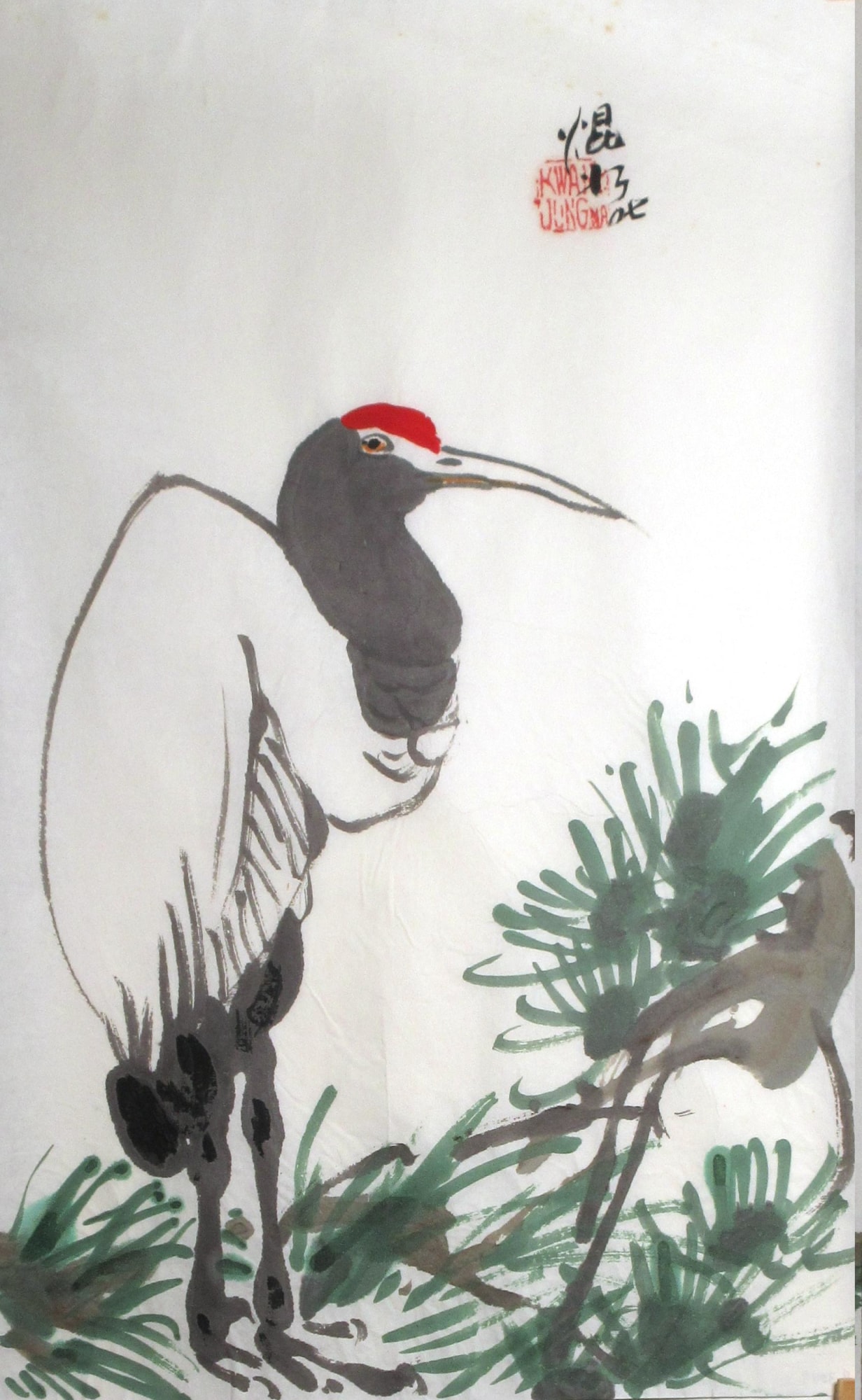 A crane with a red head stands next to fan leafed plants. Unmounted.