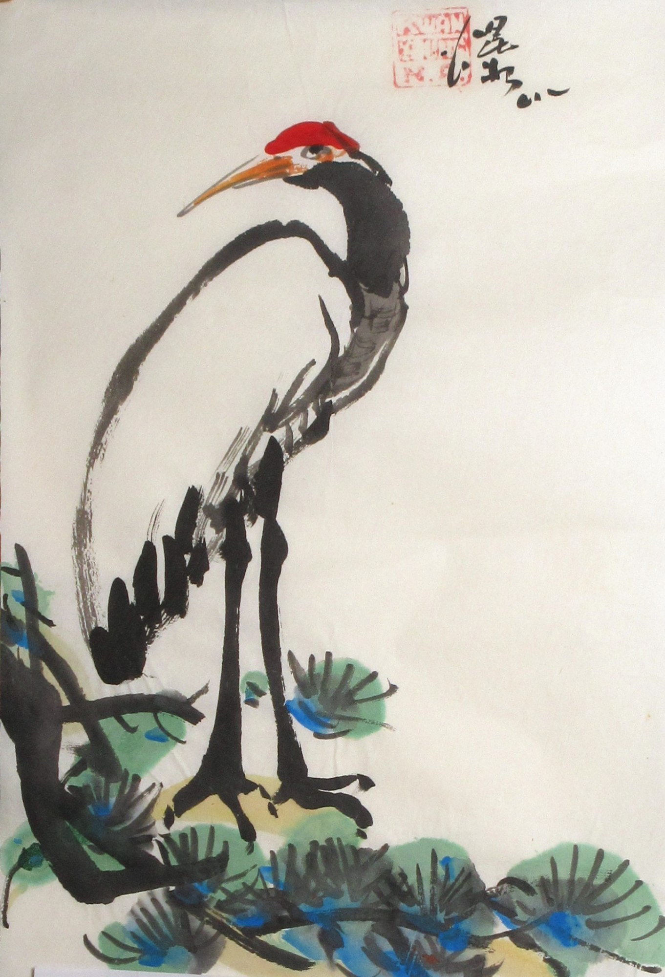 An unmounted painting of a crane near palm leaves.