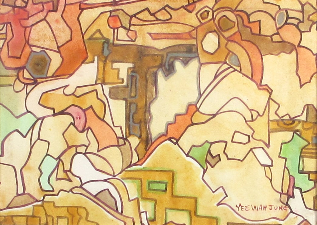 A small framed mosaic-like painting in orange, yellow, browns and greens.