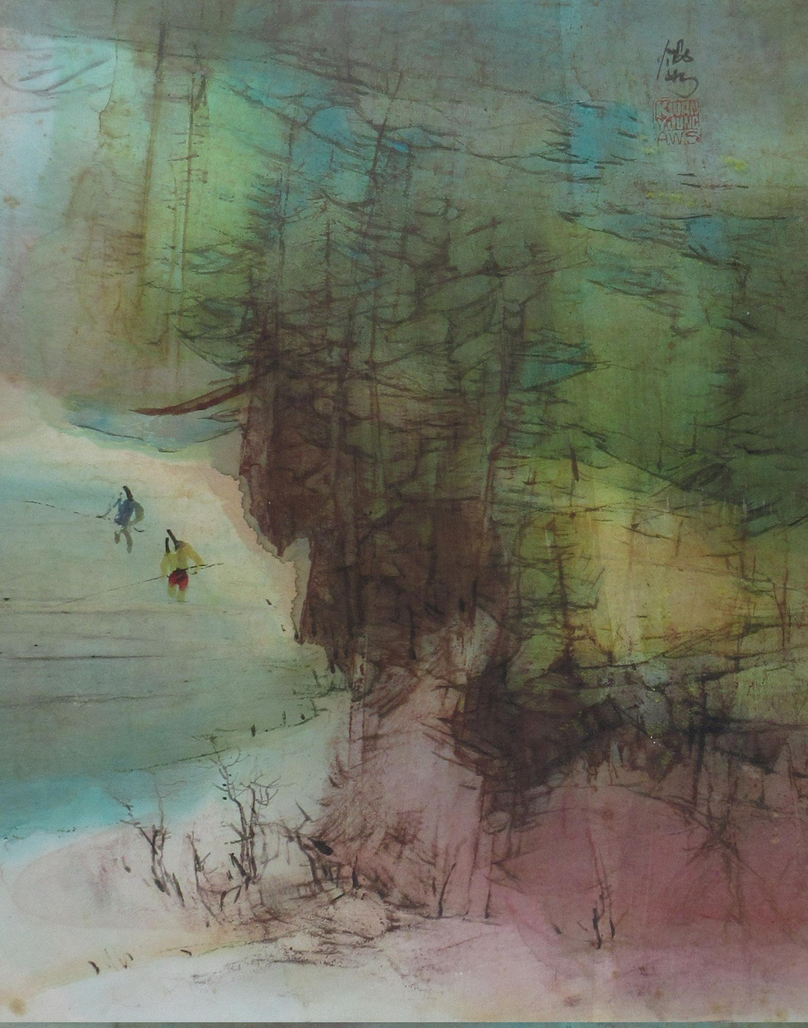 Two men fishing in a stream. Mounted on watercolor paper, in a mat board frame, backed with foam core and wrapped in plastic.